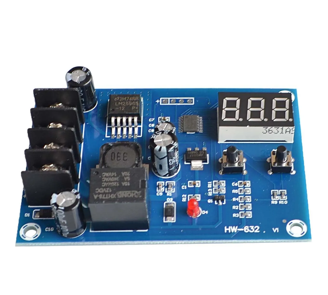Experience precise voltage management with this innovative charging control module designed for lithium batteries. Its sleek, compact design measuring 82mm by 58mm and just 18mm thick makes it perfect for DIY projects and professional applications alike. With a sturdy green PCB layout complemented by a clear digital LED display, it offers an intuitive interface for monitoring voltage levels. The bright amber or green digits provide easy reading, while the black relay and dark resistors give it a professional, industrial aesthetic. User-friendly controls allow you to set start and stop charging voltages with high accuracy. Ideal for 12–24V storage batteries, this module guarantees reliable performance, providing consistent, safe, and efficient battery management in a compact form factor.
