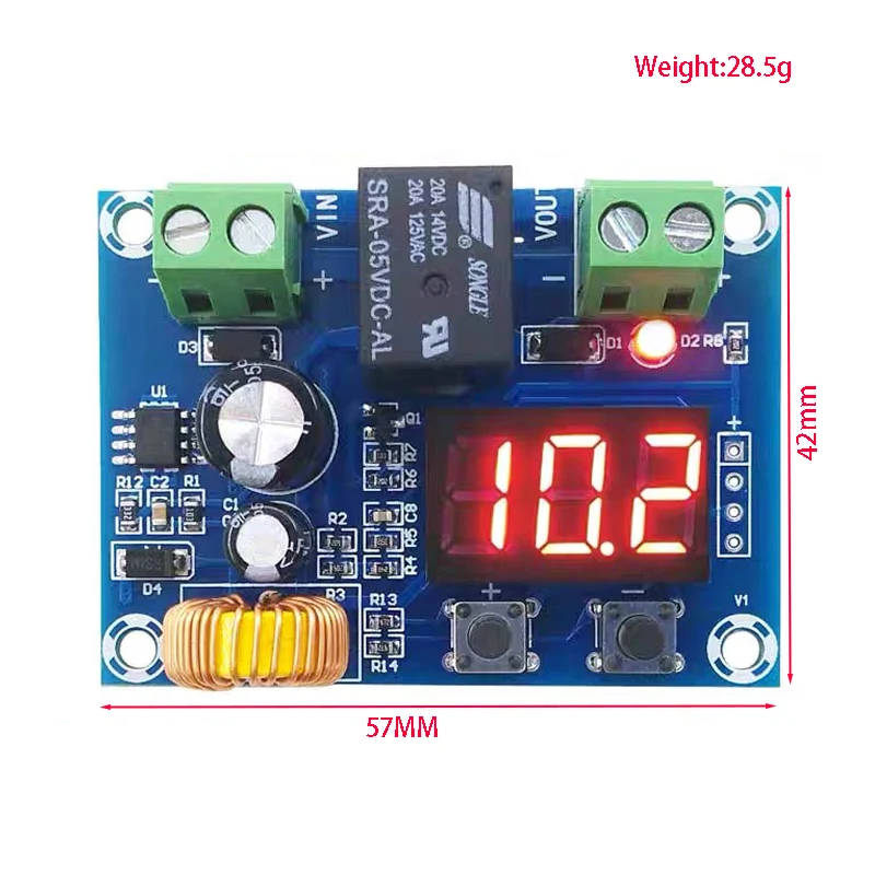 Experience reliable lithium battery management with this compact and precise voltage protection module. Its vibrant blue circuit board, measuring 57mm by 42mm by 19mm, combines a clean, technical aesthetic with practical functionality. The prominent red seven-segment LED display provides instant voltage readings with an accuracy of 0.1V, making monitoring straightforward and effective. Two vivid green terminal blocks on either side facilitate easy connection to your power source while the large silver potentiometer allows precise voltage threshold adjustments. Surface-mounted resistors, capacitors, and integrated circuits densely populate the circuit, ensuring stable regulation and control. This module’s design emphasizes clarity, durability, and ease of installation—ideal for safeguarding your lithium storage batteries within the 12V to 36V range, streamlining your energy management system.