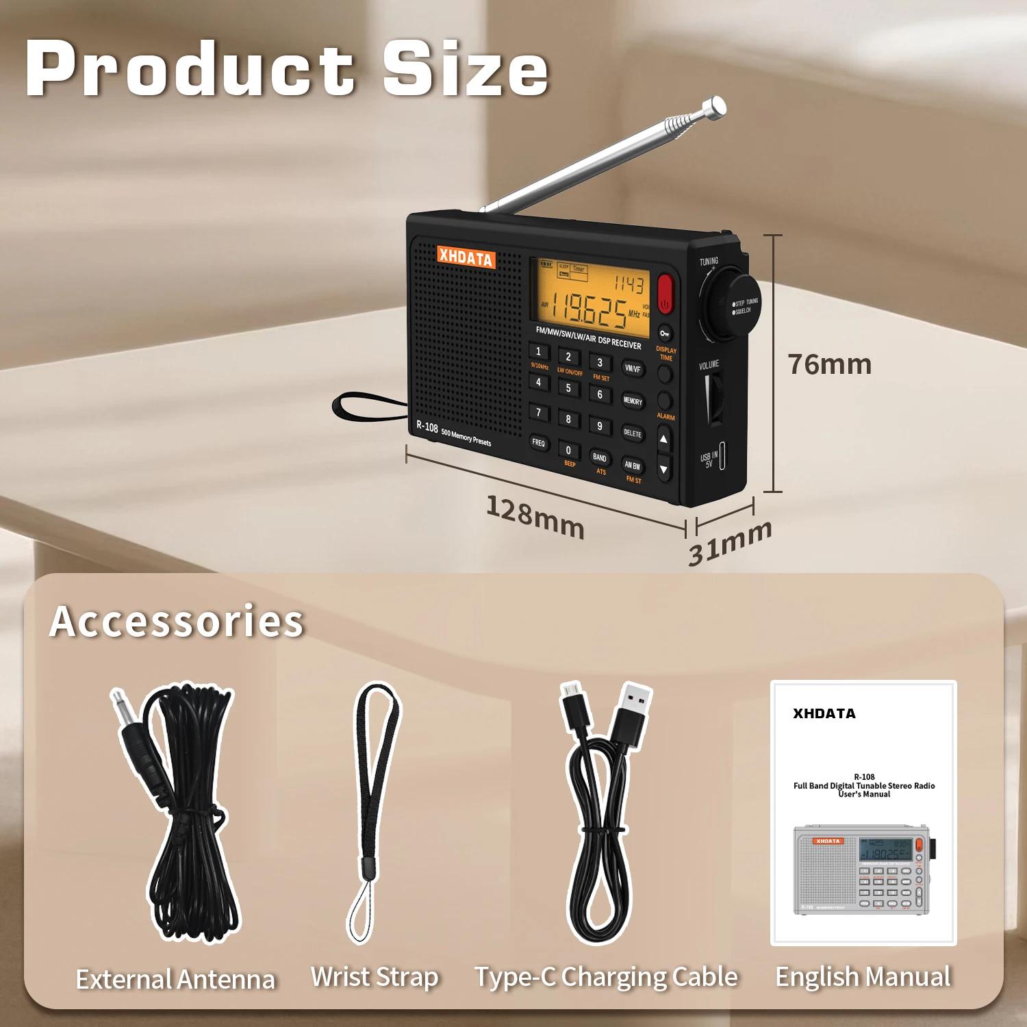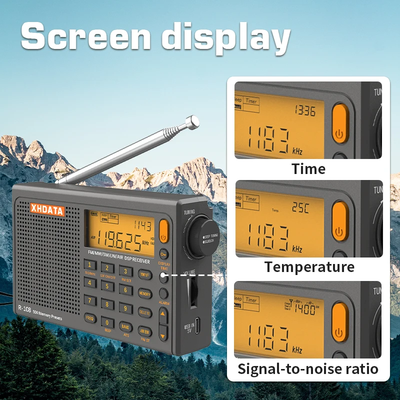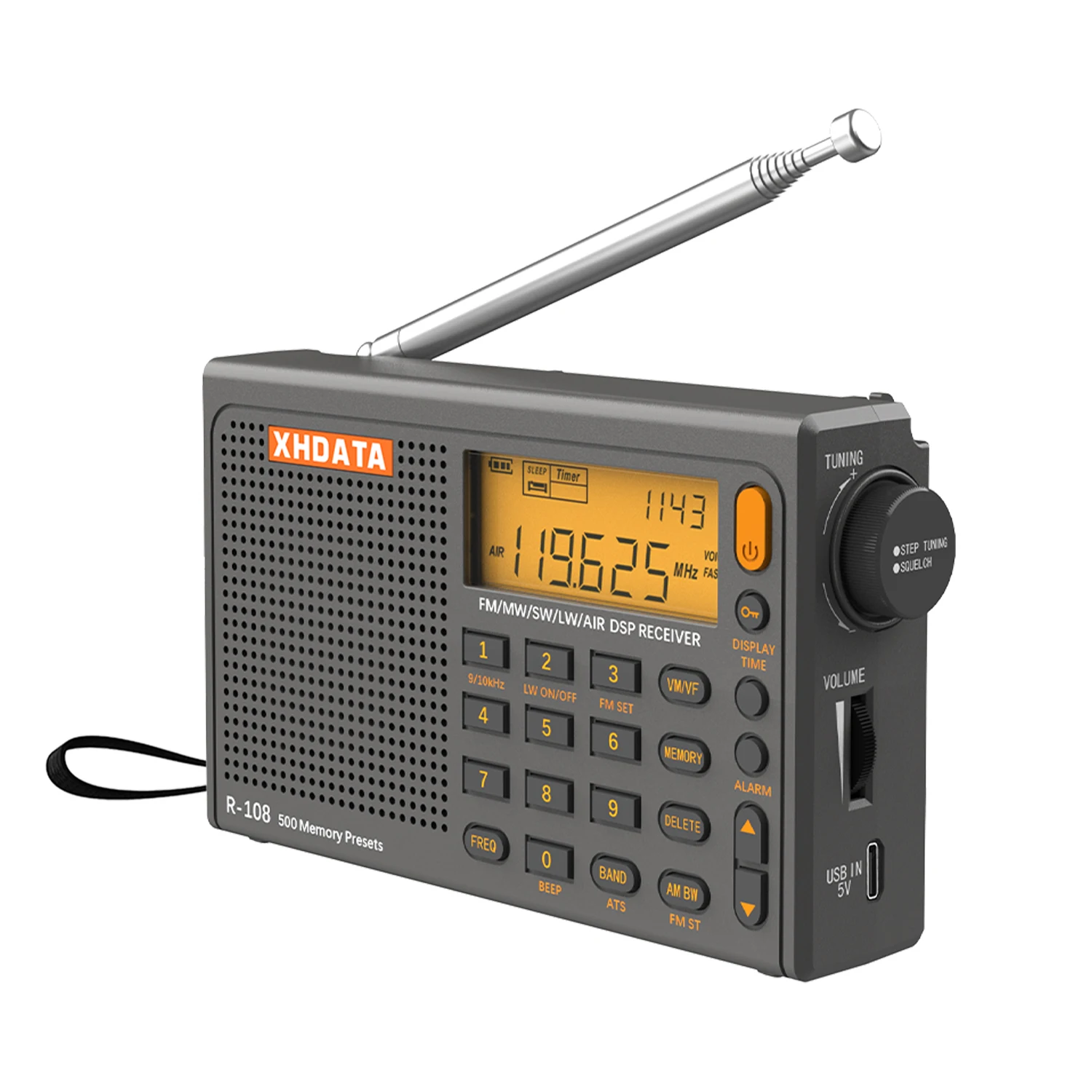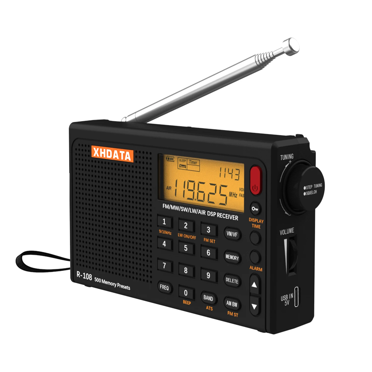 Seize the opportunity to own this versatile and stylish portable radio. Its wide frequency coverage, extensive memory presets, and clear sound quality make it an ideal companion for staying connected to your favorite broadcasts anywhere. Whether you're a radio enthusiast, avid traveler, or someone who enjoys outdoor adventures, this radio is designed to meet your needs. With its intuitive controls and reliable performance, you'll find it a joy to use day after day. Imagine waking up to your favorite station or tuning into weather updates during your outings. Elevate your listening experience—make this XHDATA R-108 yours today and never miss a beat.