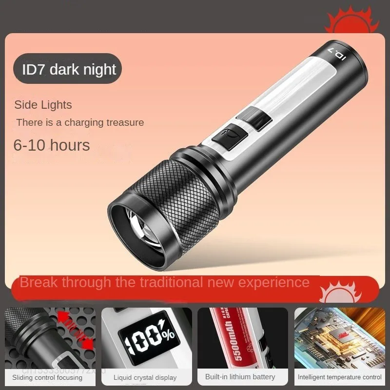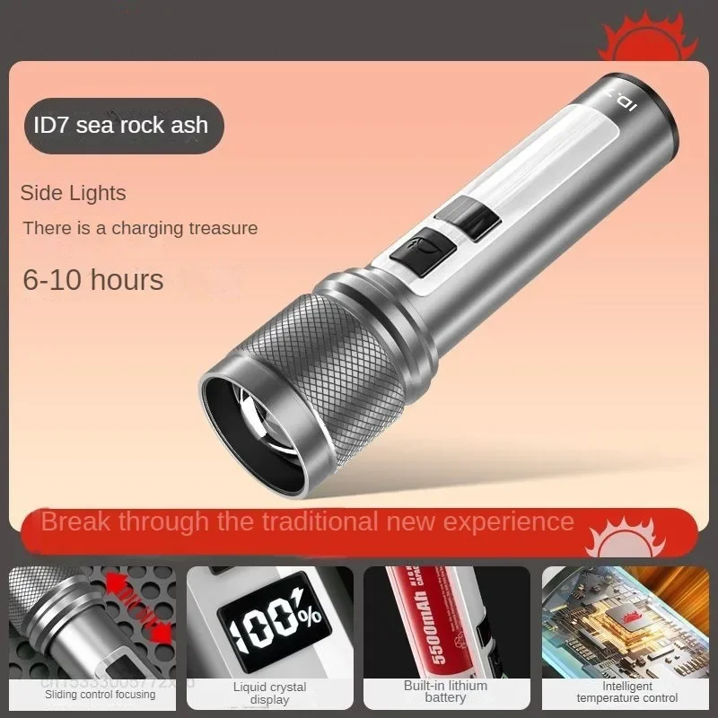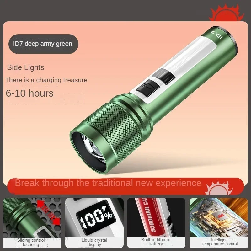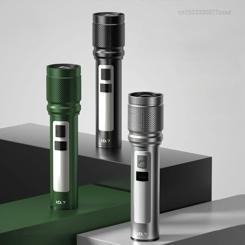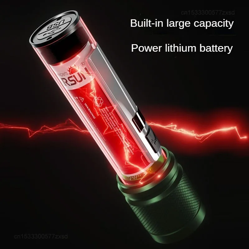 Experience powerful illumination with this portable, rechargeable flashlight featuring a durable waterproof aluminum alloy body. It offers 1200 lumens and a beam distance of over 500 meters, perfect for outdoor adventures. The adjustable focal length and hard light function enable precise control over beam focus, while integrated side lights provide versatile lighting options. Available in black, gray, and green, this multifunctional emergency light is designed for rugged use, supporting multiple modes for optimal performance. Certified with CCC and environmentally friendly, it includes batteries for immediate use, combining durability, high brightness, and portable convenience for all your outdoor and emergency needs.