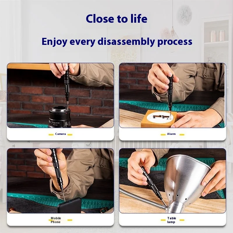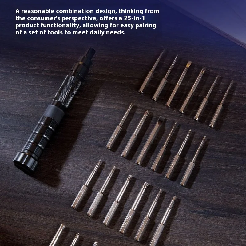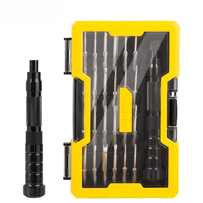 Experience precision and versatility with this cordless magnetic screwdriver set, available in 24-in-1 and 25-in-1 configurations. Featuring durable chrome-vanadium steel screw heads of size 1, this high-quality toolkit is perfect for home repairs, laptop, watch, mobile phone, and computer maintenance. The sleek, black handle with a textured, knurled grip provides a comfortable, secure hold, while the set’s organized black plastic case with a bright yellow interior ensures easy access and portability. Designed for durability and efficiency, this eco-friendly set combines modern aesthetics with practical functionality, making it the ideal choice for both professional technicians and DIY enthusiasts seeking reliable, high-performance tools.