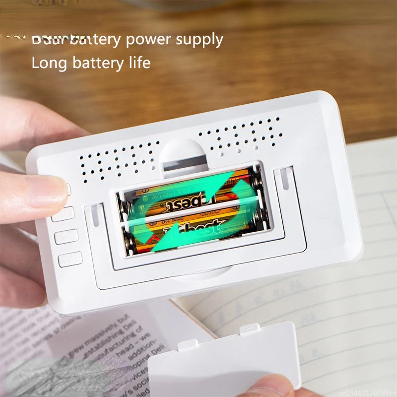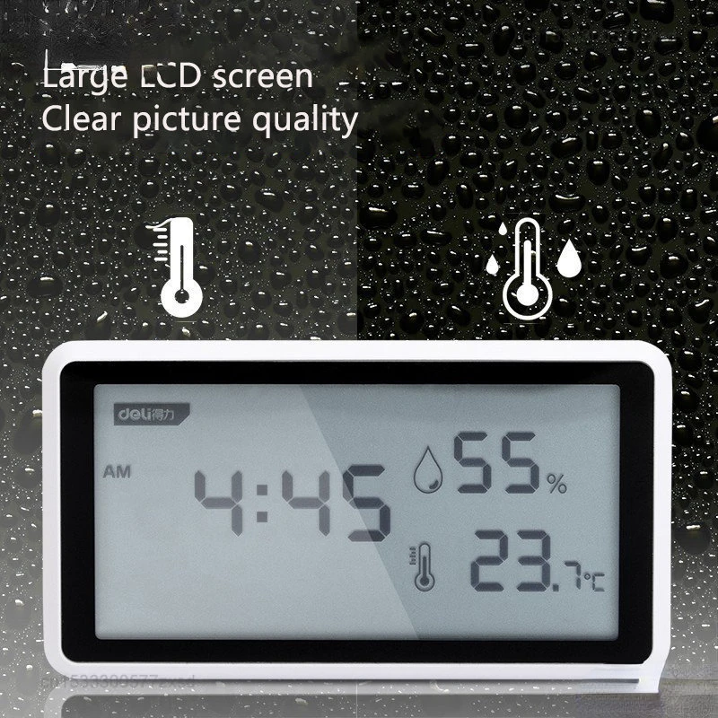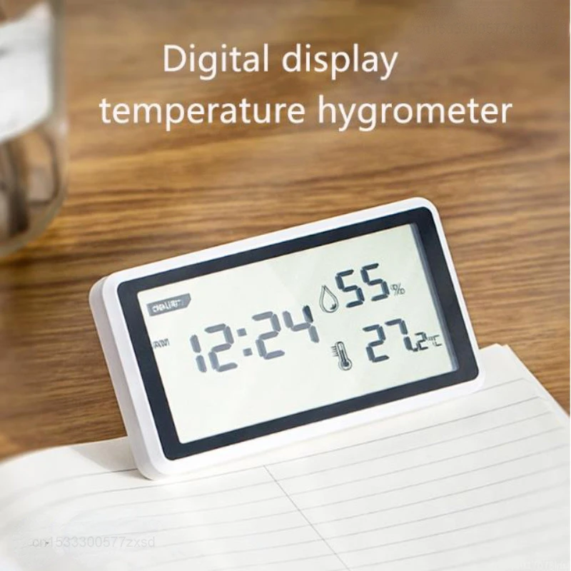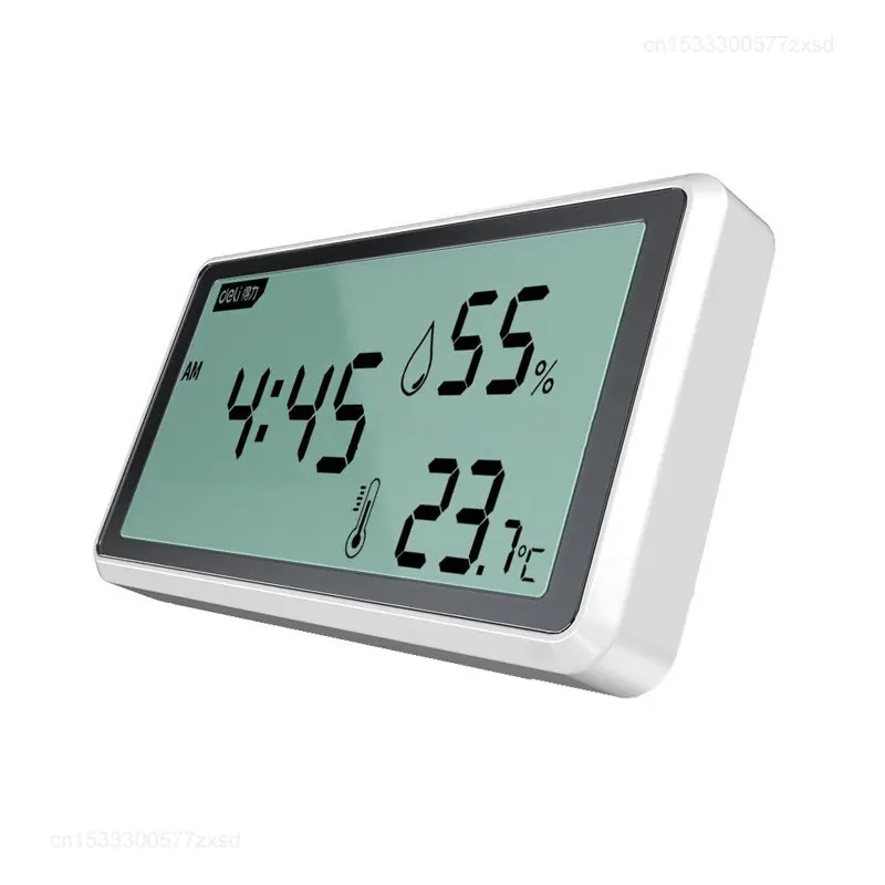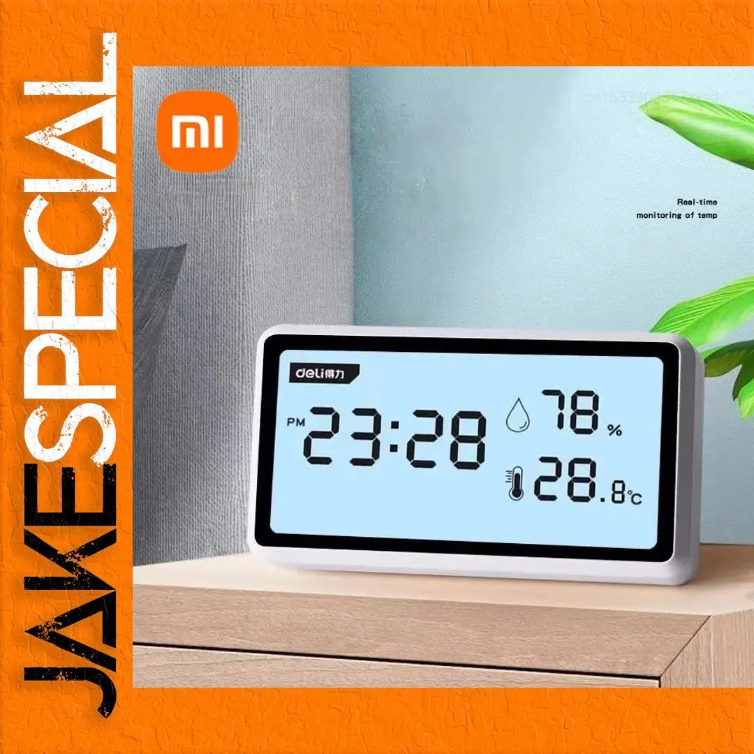 Experience precise indoor climate monitoring with this sleek Xiaomi Deli electronic thermometer hygrometer weather station, model DL336001. Featuring a large 4-inch LCD display, it simultaneously shows time, temperature (accurate to 0.1°C within a range of -10°C to 60°C), and humidity levels with an accuracy of ±1°C and visible icons for easy reading. Powered by dual AAA batteries with up to 12 months of life (batteries not included), it includes an adjustable stand angled at 53° for comfortable viewing. Its minimalist white body with a black border, side air inlets for optimal airflow, and straightforward design make it an ideal addition to any household environment dedicated to reliable indoor climate management.