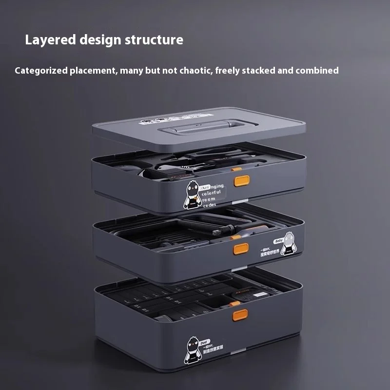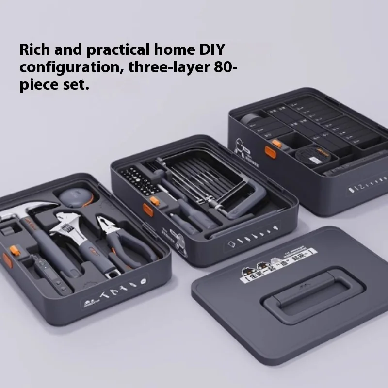 Experience the ultimate in home repair with this versatile multifunctional toolset, featuring 80 to 90 pieces crafted from durable chrome-vanadium steel. Designed for household and electrical tasks, it includes various screwdrivers, bits, and hand tools with a screw head size of 1. The set comes organized in a sleek, rectangular storage box, making access and storage effortless. Its modern design, with black, gray, and vibrant orange accents, combines practicality with a high-quality aesthetic. Perfect for tackling a wide range of projects, this environmentally conscious repair kit ensures reliability and convenience for any serious DIY enthusiast or professional.