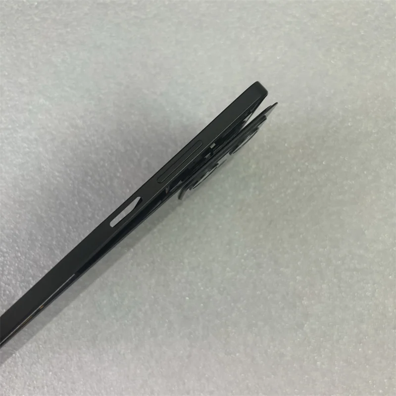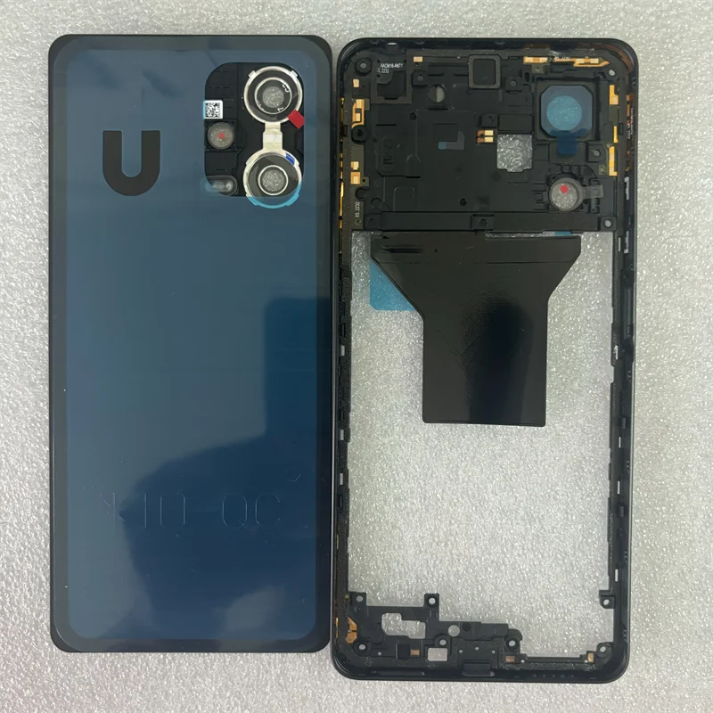 This replacement set for the Xiaomi Redmi Note 12 Pro 5G includes a black middle frame, a sleek glossy black battery back cover, and camera lens parts. The middle frame is designed with precise cutouts for buttons, connectors, and mounting points, ensuring a robust fit within the phone’s casing. The back cover features a smooth texture and includes a camera module with openings for two lenses and a smaller auxiliary lens, labeled ’50MP’, indicating high-quality camera capability. Available colors are White, Blue, and Black, offering options for aesthetic customization. Professional installation is recommended for optimal results.