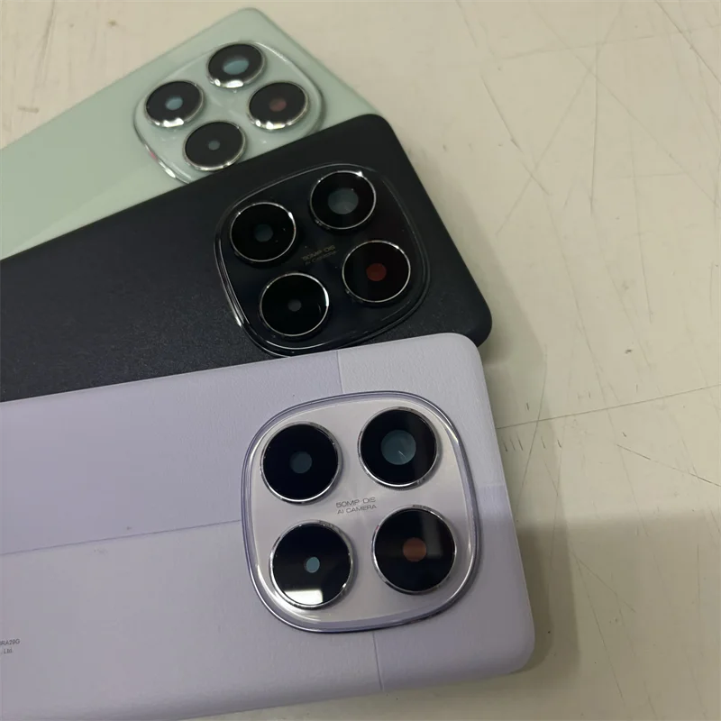 The product features three beautifully designed battery covers specifically for the Xiaomi Redmi Note 14 Pro 5G, allowing you to customize your device according to your style. Each cover showcases unique color shades and textures: the light green cover boasts a shiny, pearlescent finish for a reflective appeal; the lavender cover offers a smooth, matte surface with a soft pastel hue; and the black cover presents a sophisticated, slightly grained texture. Each cover provides dedicated spaces for camera lenses, ensuring functionality and style in one package.