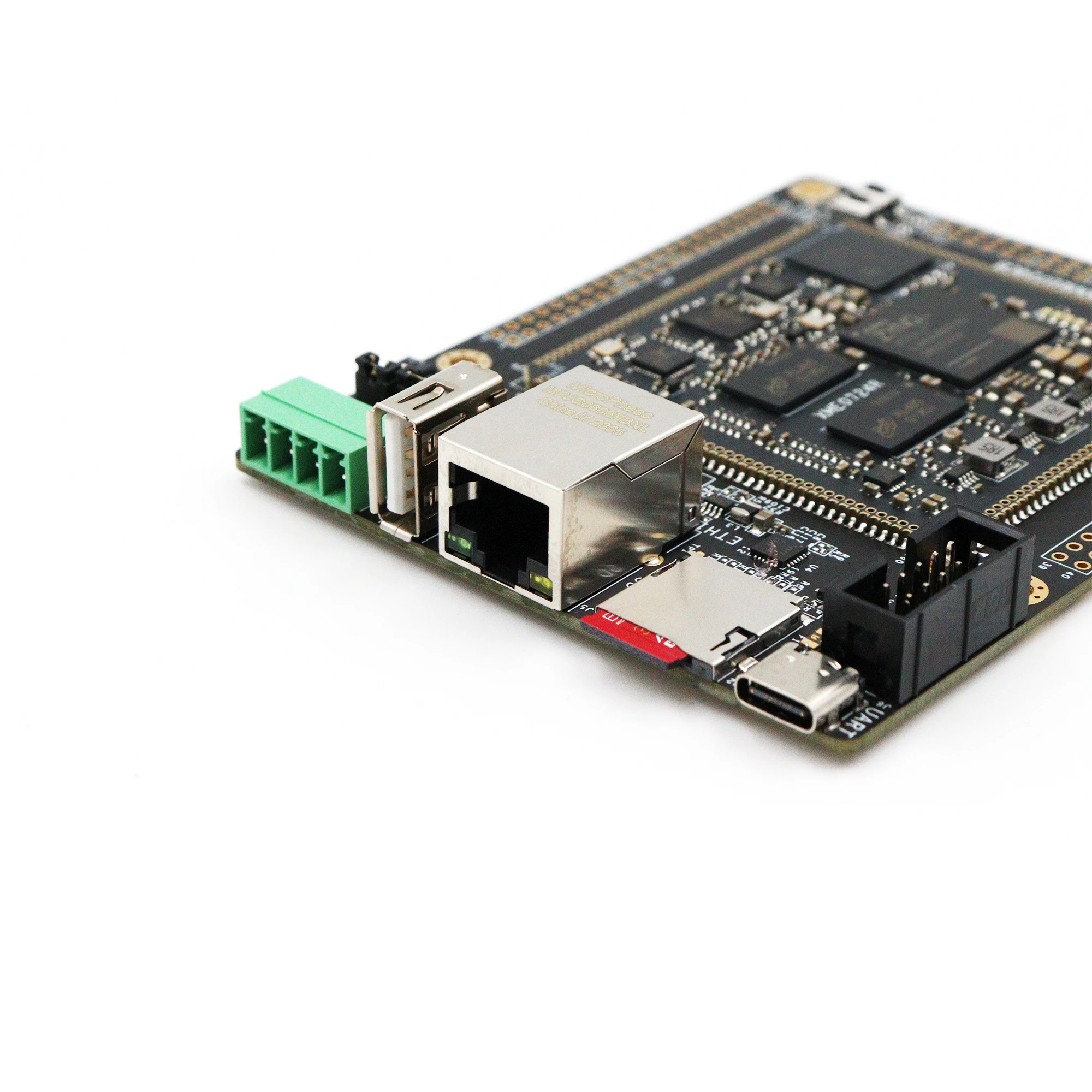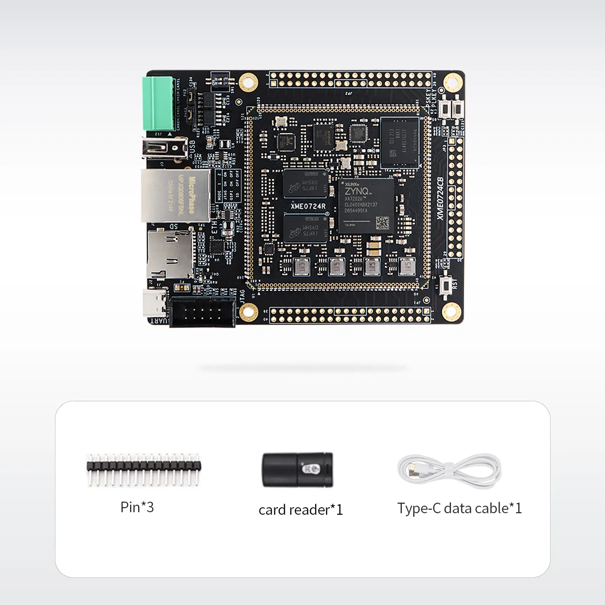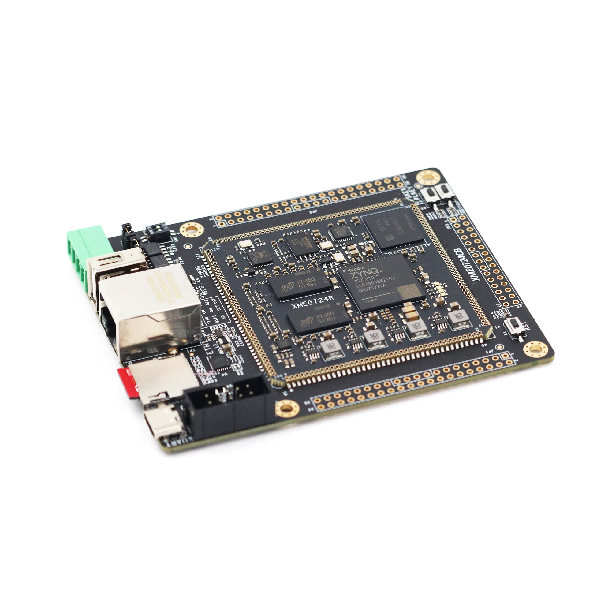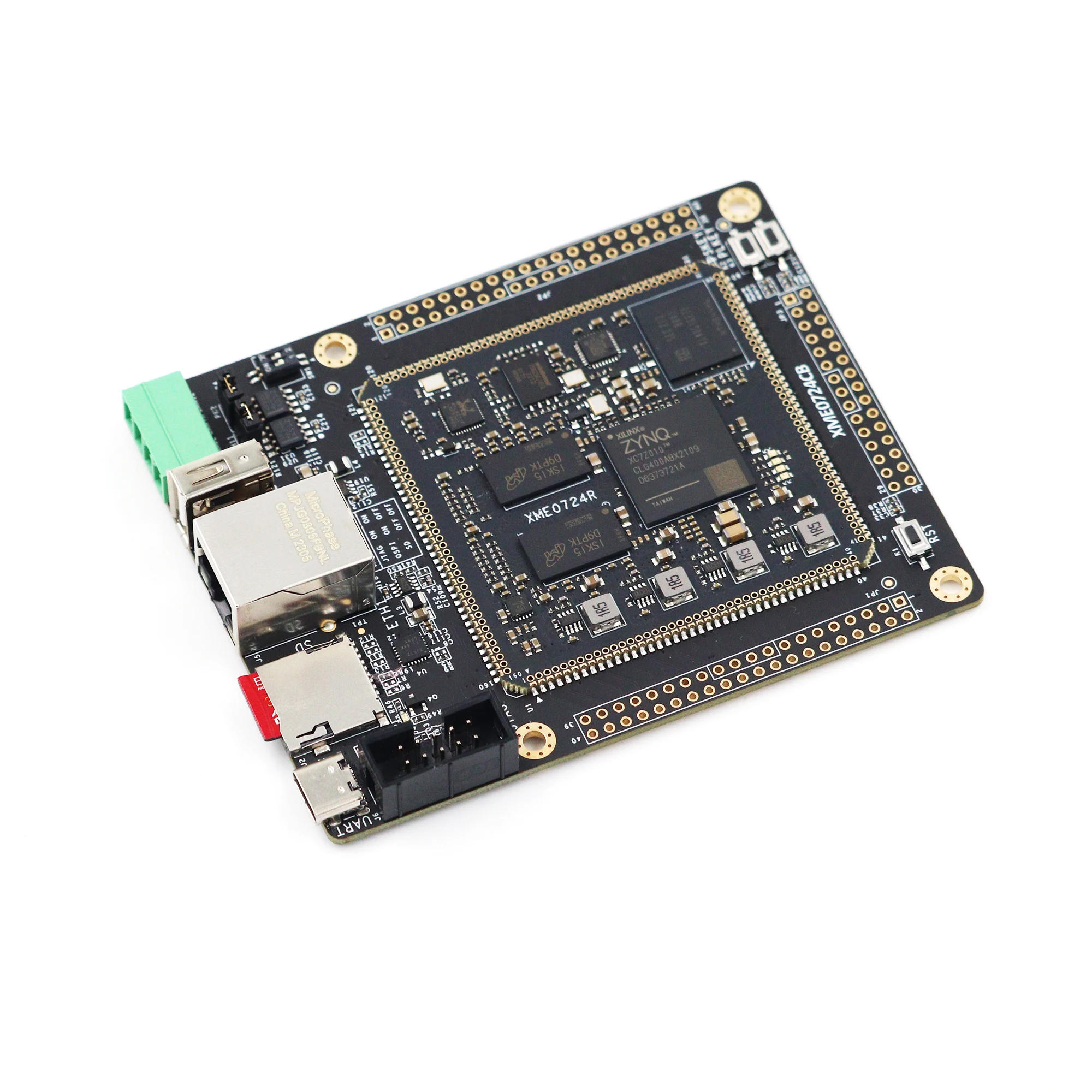 Experience powerful FPGA development with the Xilinx Zynq ARM core board, featuring models 7010 or 7020 and utilizing the XME0724CB module. Designed for precision and organization, this compact, black circuit board showcases gold or copper contact points and a neatly arranged layout of surface-mounted components, including the central FPGA chips. With clearly defined ports such as USB and Ethernet, along with headers for expansion, it offers a professional, sleek aesthetic. Operating at 5V with a current capacity of 2A, this board provides a robust platform for complex FPGA projects, perfect for developers seeking a reliable and visually refined testing environment.