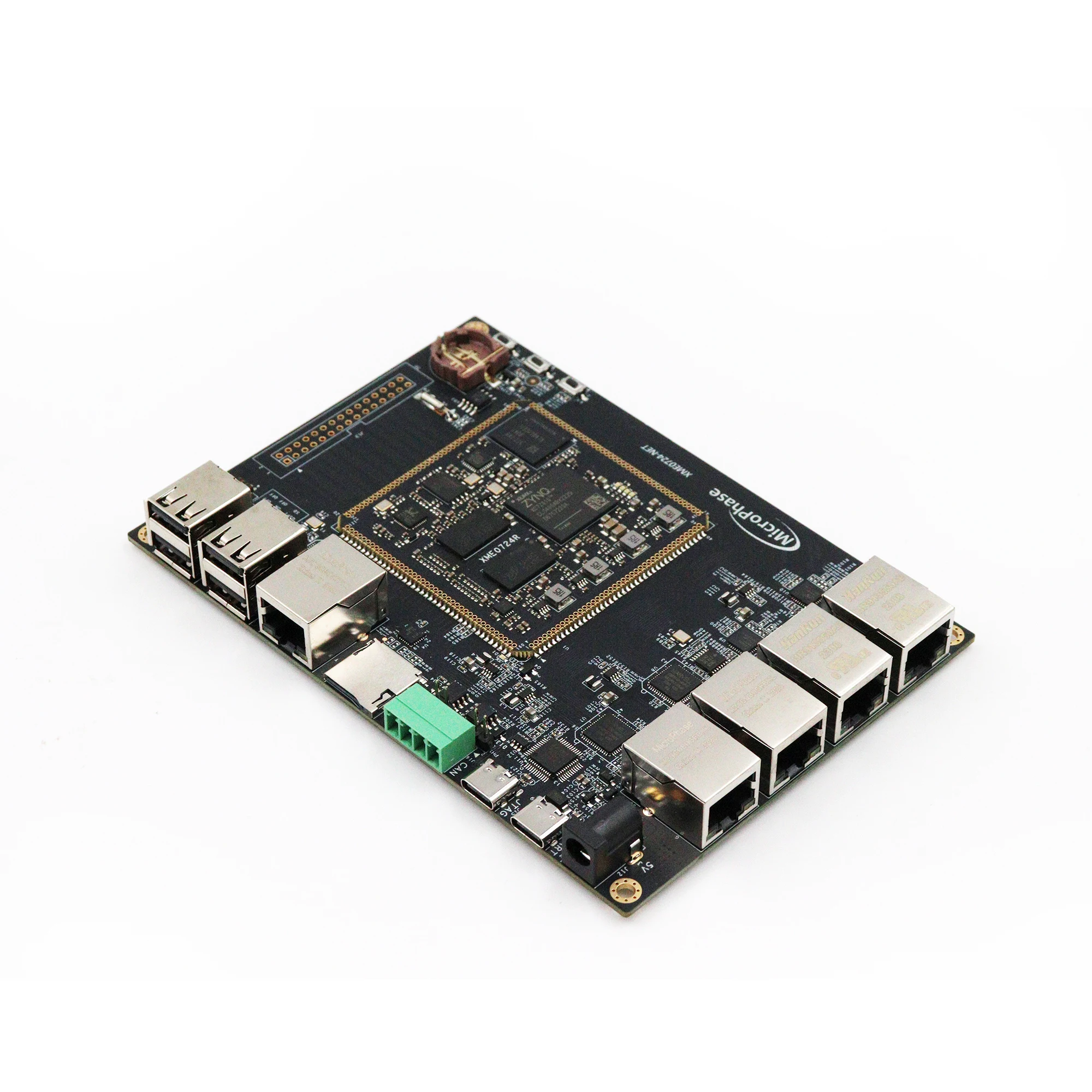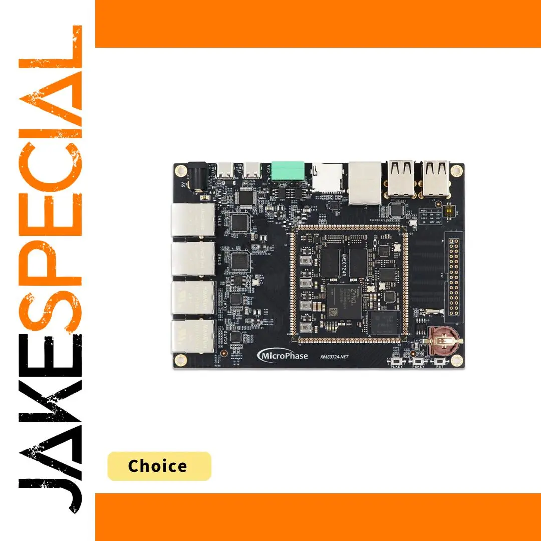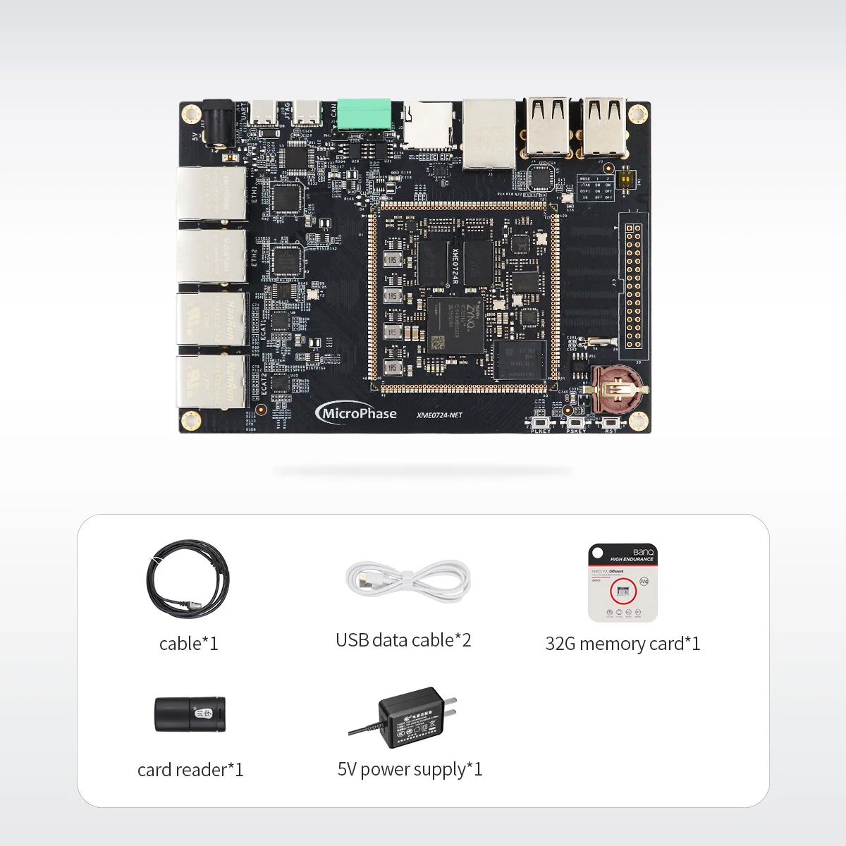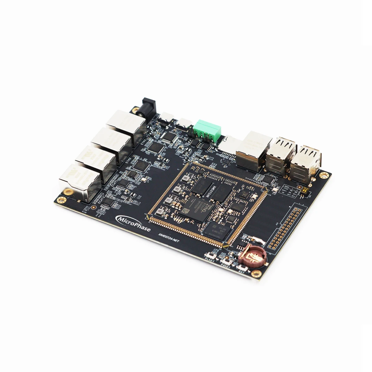 Experience advanced FPGA development with the Microphase Xilinx Zynq ARM-based board, models 7010 or 7020, specifically designed for industrial networking applications. Featuring a sleek black PCB, the board showcases a large square FPGA chip with gold and white markings at its center, surrounded by meticulously arranged smaller components, resistors, and capacitors. It boasts multiple high-speed Ethernet ports, USB ports, and pin headers with metallic finishes, emphasizing durability and high-tech sophistication. Operating at 5V with a 2A current rating, this robust board is ideal for professional industrial environments, providing exceptional connectivity and performance for your FPGA projects. Available in two bundles: XME0724-20I-NET and XME0724-10C-NET.
