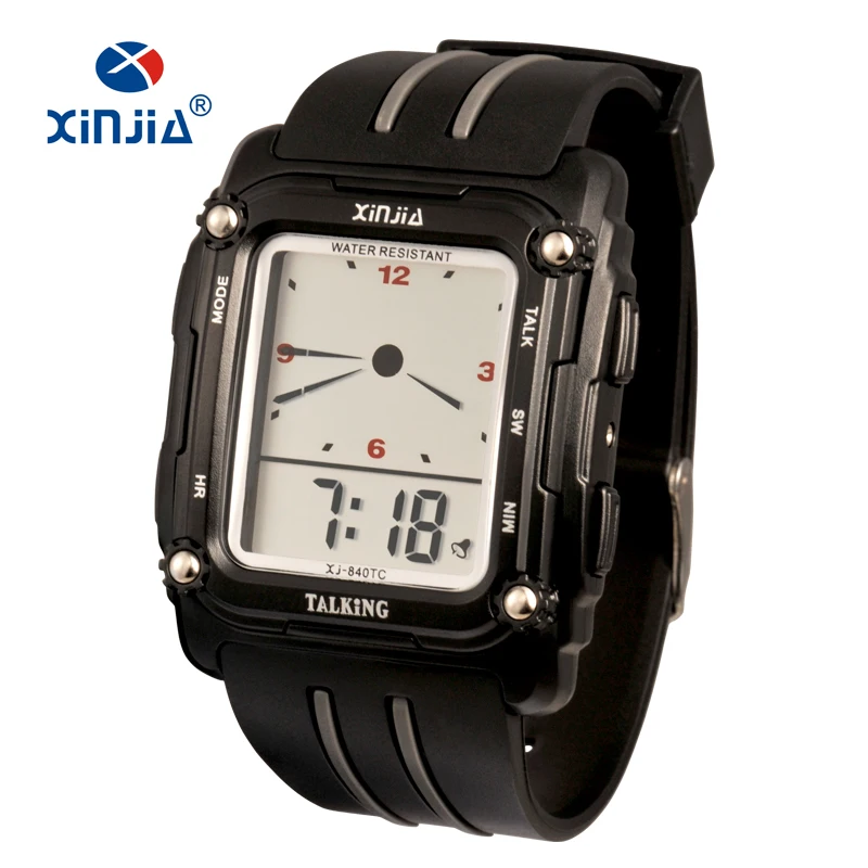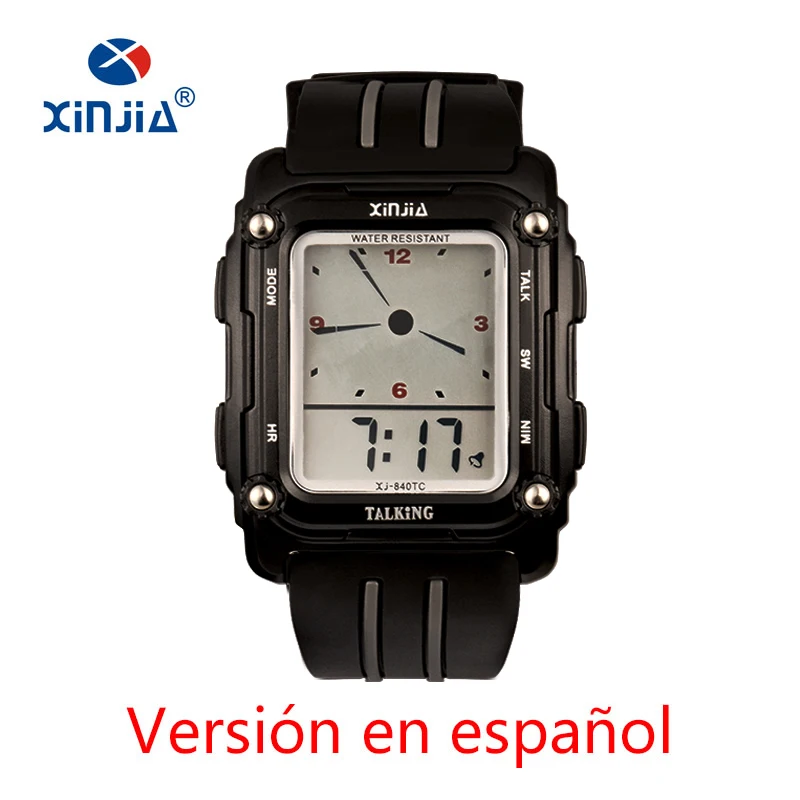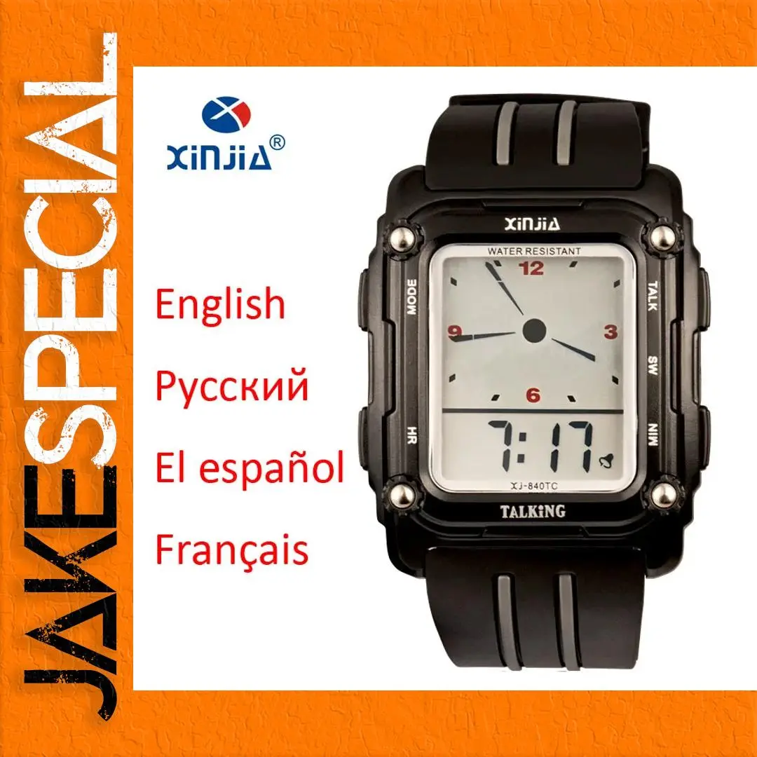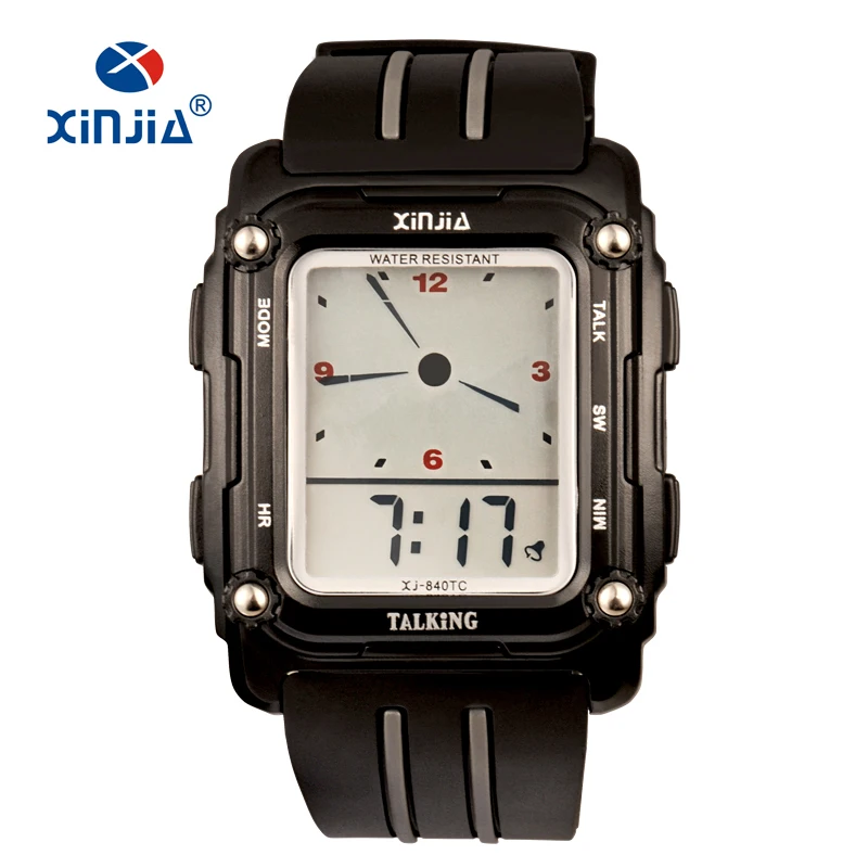 Imagine wearing a stylish timepiece that combines functionality with a modern aesthetic. This talking watch, model XJ-840T by XINJIA, features a sturdy rectangular ABS case with a sleek matte black finish. Measuring 40mm in diameter and 16.5mm in thickness, it embodies robustness and elegance. Its dial integrates both analog and digital displays, presenting the time clearly and audibly with multilingual capabilities in English, Spanish, Russian, and French. Water-resistant to 1 ATM, it's ideal for everyday wear, including washing hands in light rain. Crafted with a durable TPU resin strap that's 240mm long and 24mm wide, this watch ensures comfort and style for any occasion.