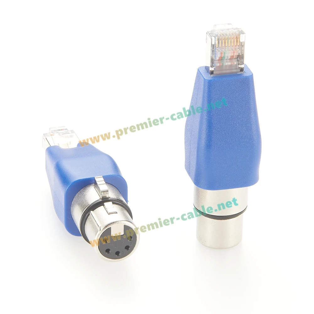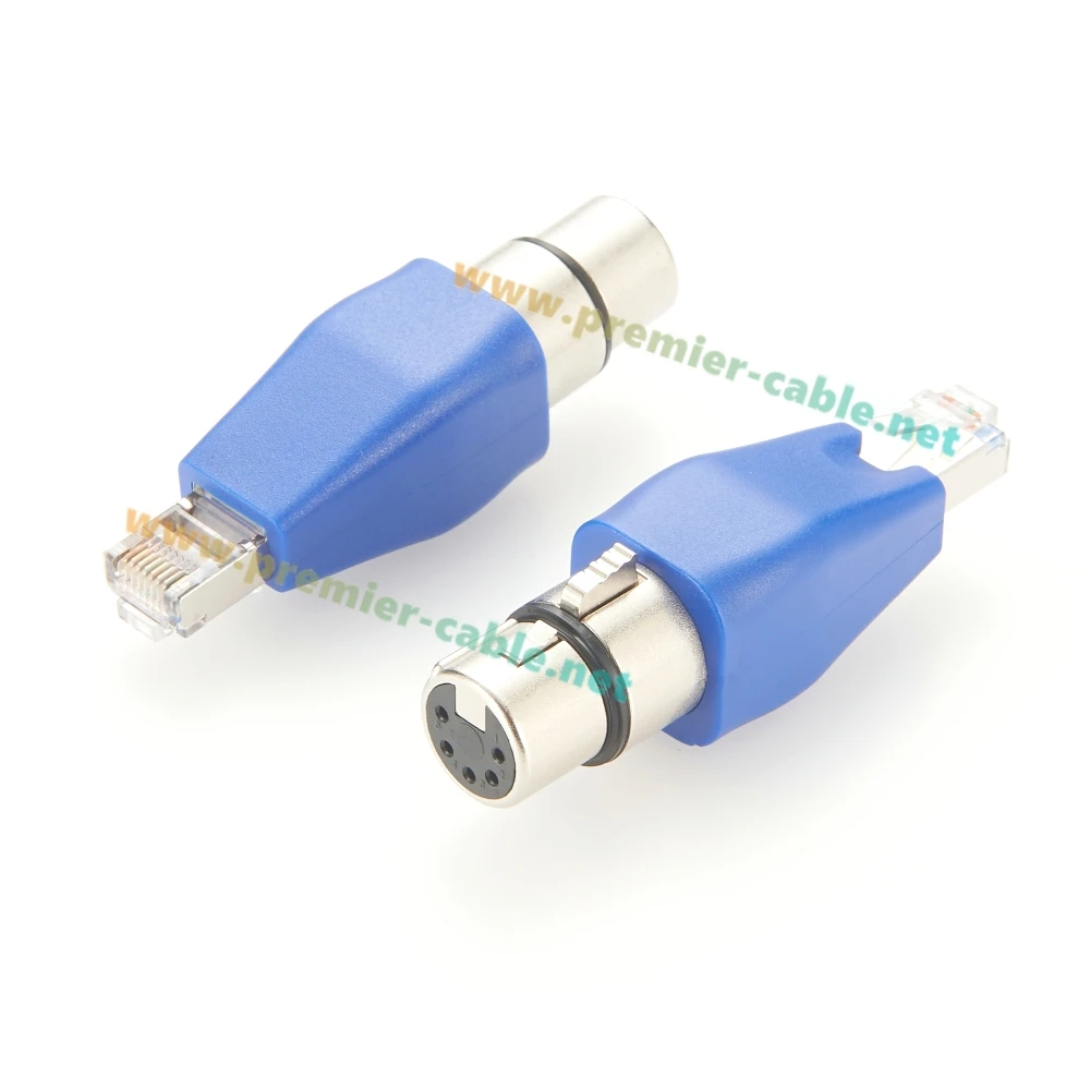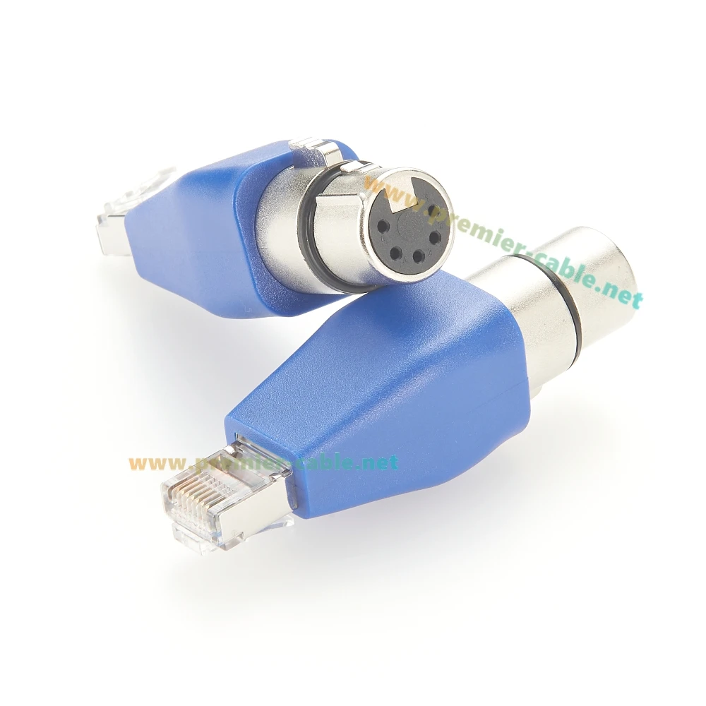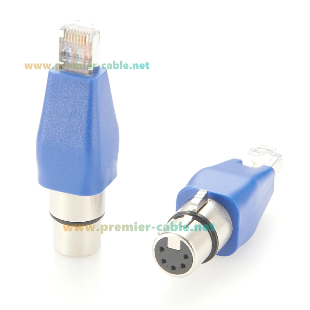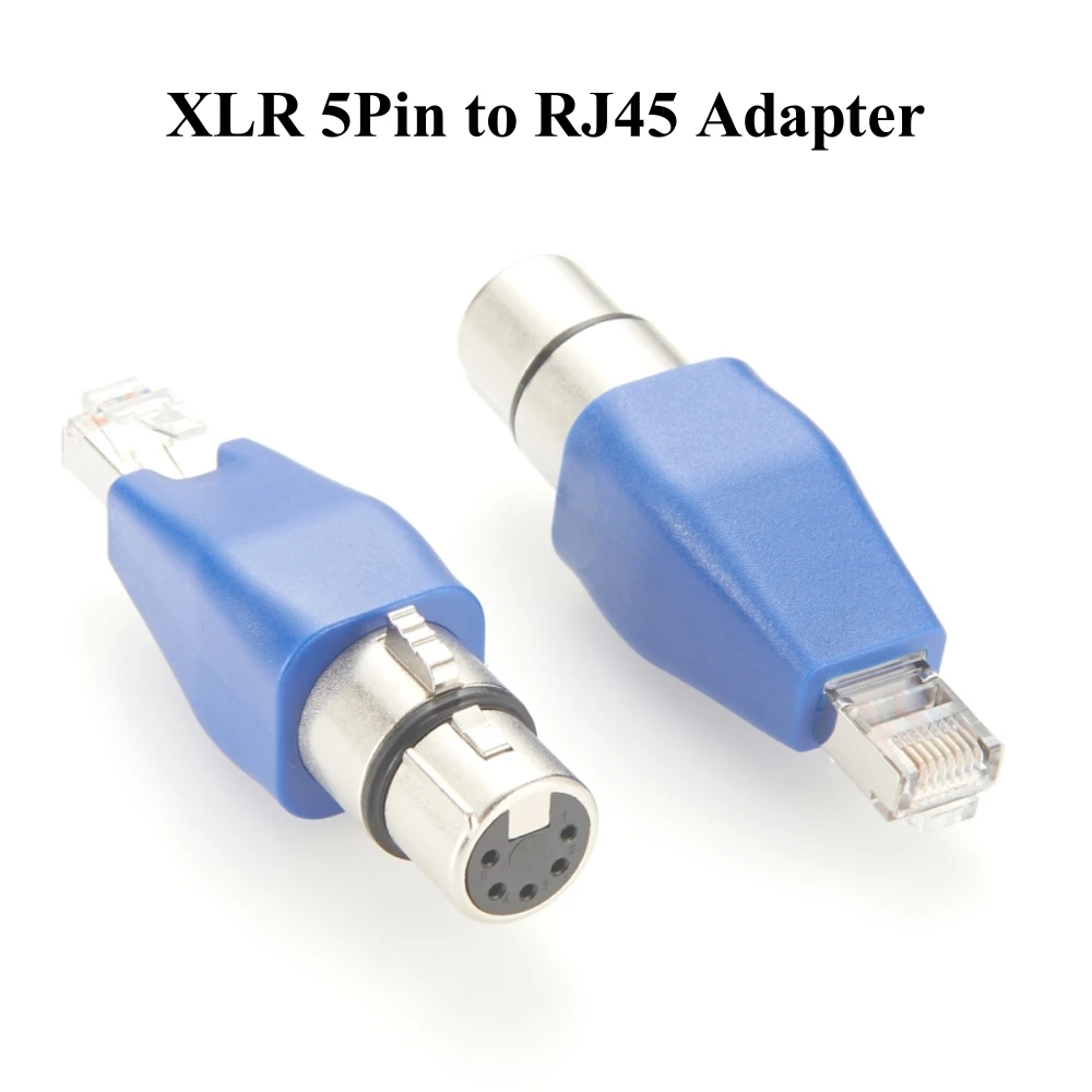 - 5-pin XLR female to RJ45 CAT5E male connectors with a professional, sleek design for reliable connections in audio and lighting setups.