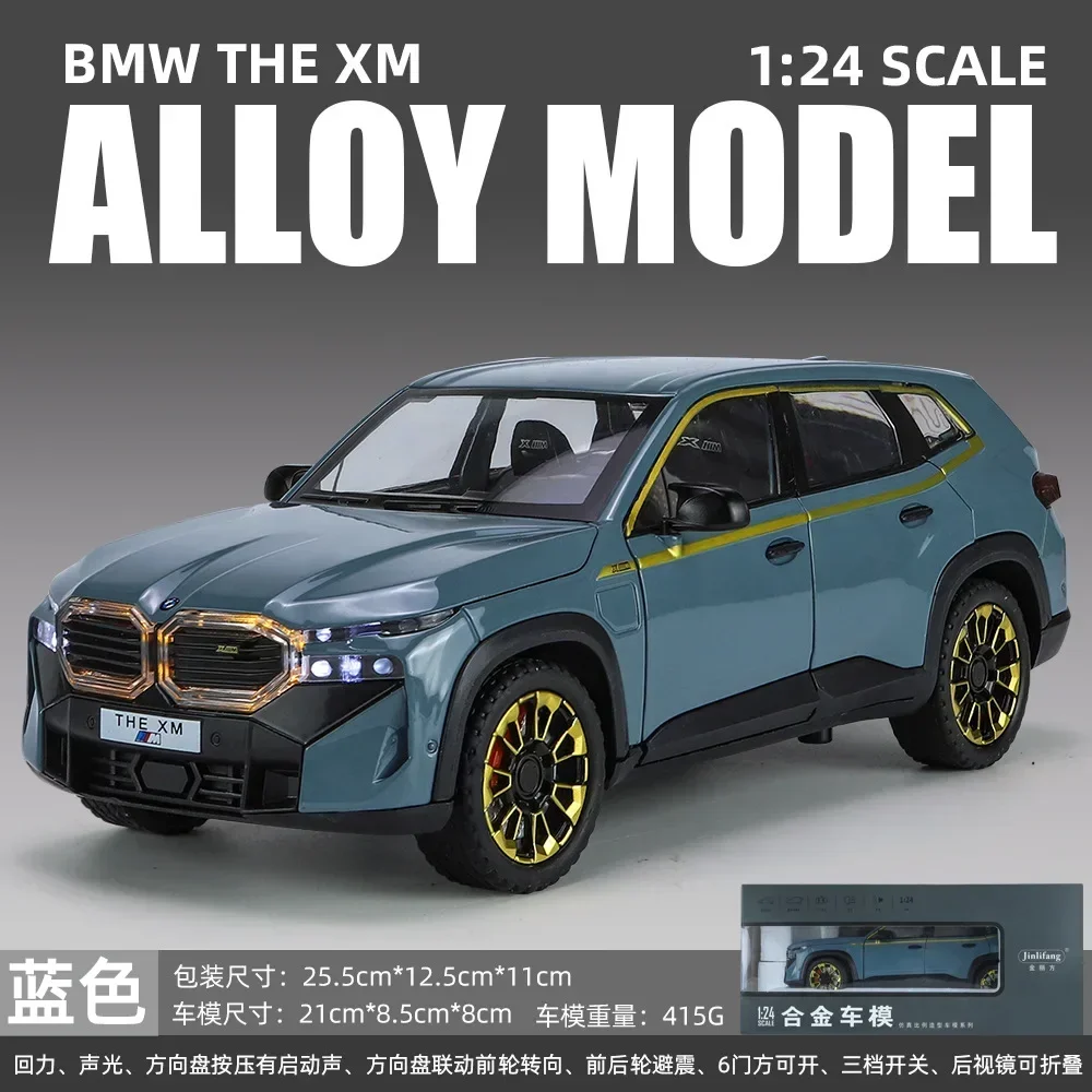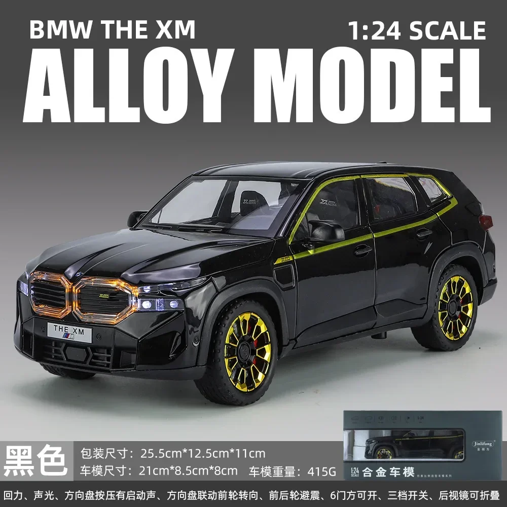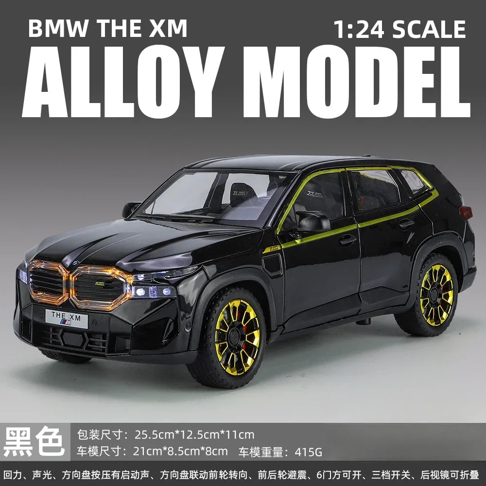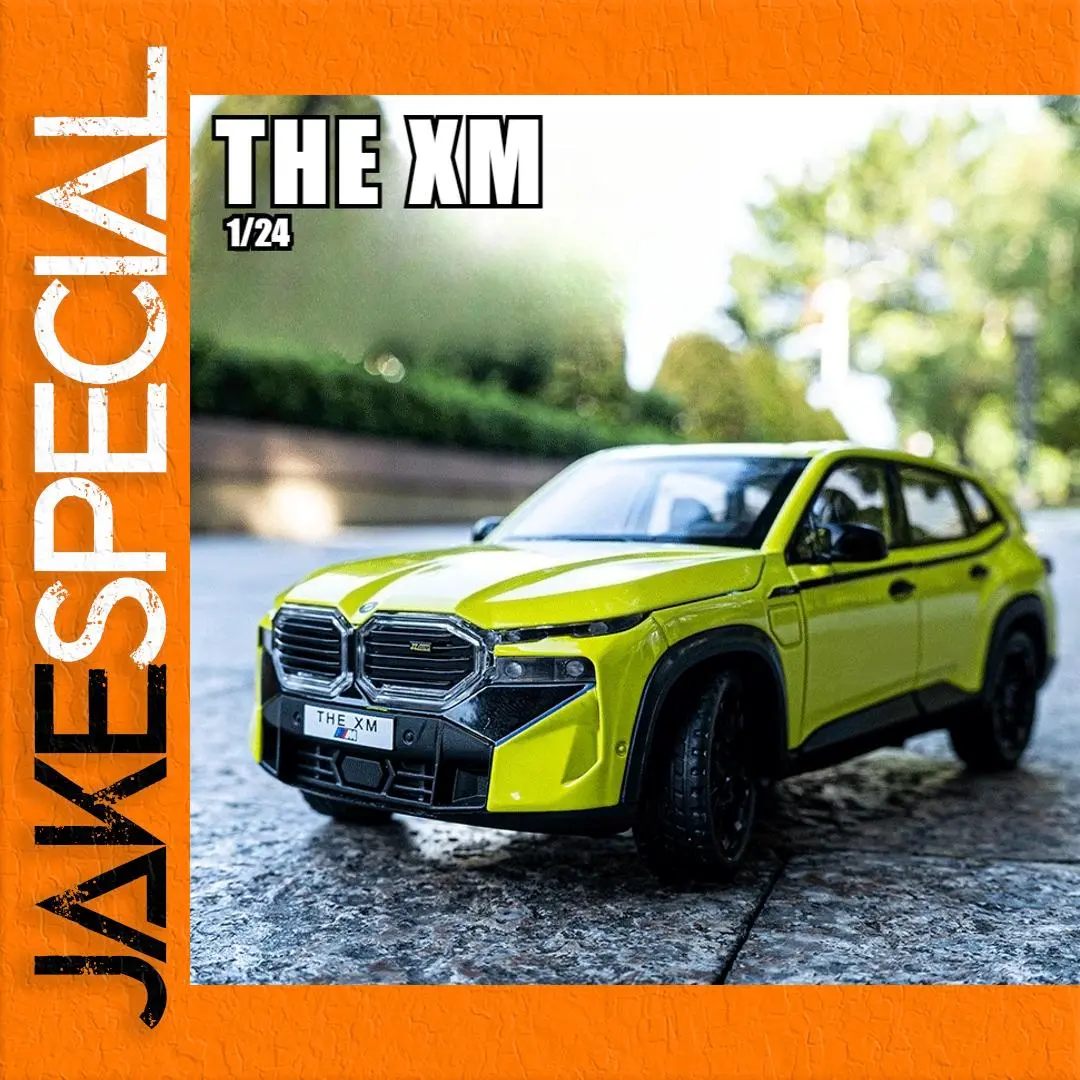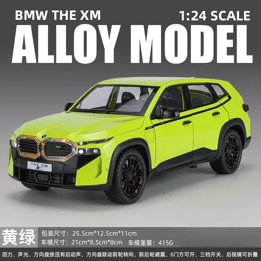 The 1:24 scale diecast model car of the XM SUV showcases a vibrant fluorescent yellow finish and a meticulous attention to detail. Constructed from metal alloy, it features a chrome double kidney grille and a robust matte black front bumper for striking contrast. The model is equipped with sporty black alloy wheels with a multi-spoke design and rugged textured tires. Clear windows and black side mirrors complement its sleek, modern silhouette, while the smooth lines and sculpted side panels enhance its aesthetic appeal. Additionally, it includes sound and light functions powered by a button battery, providing an engaging collectible experience.