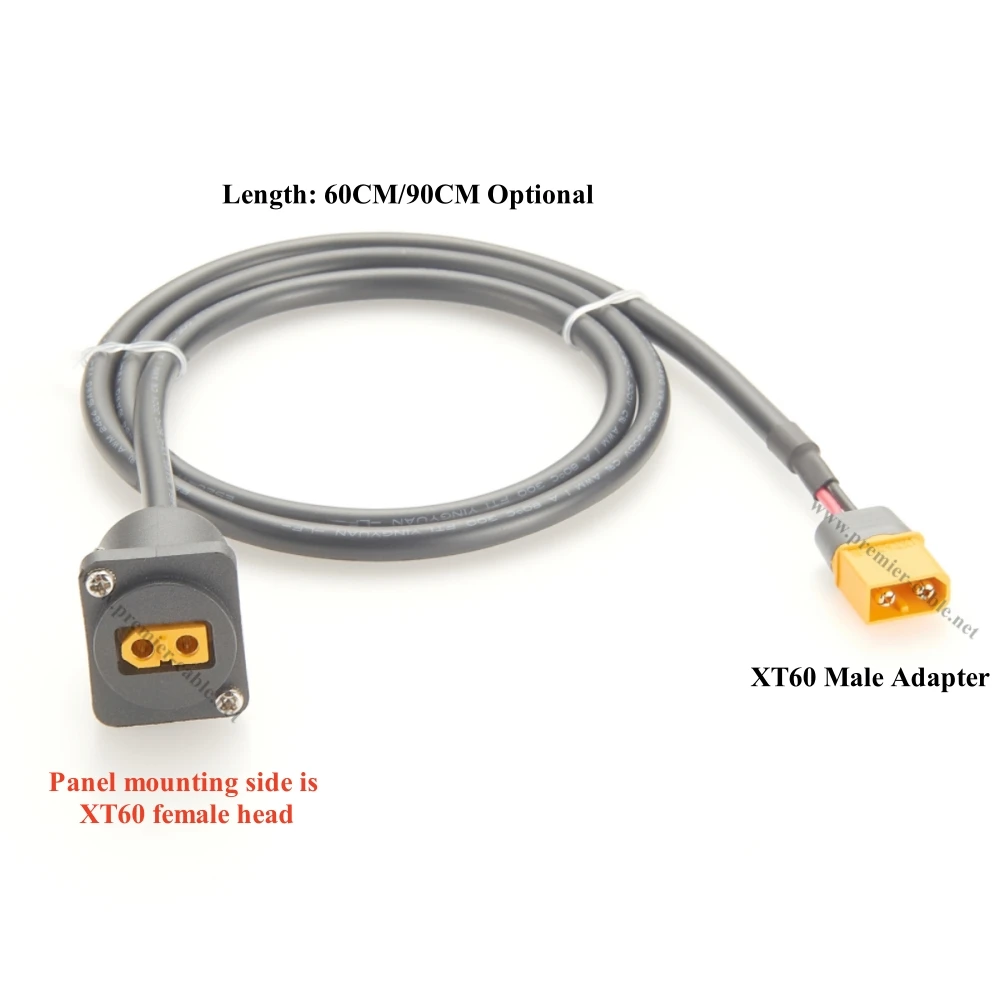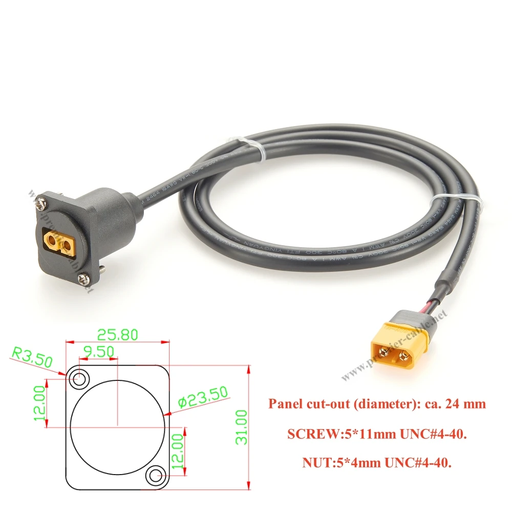 - The panel mounting side features a female XT60 connector with a 24 mm diameter cut-out, secured with two small screws and a nut, ensuring a sturdy and reliable installation.
