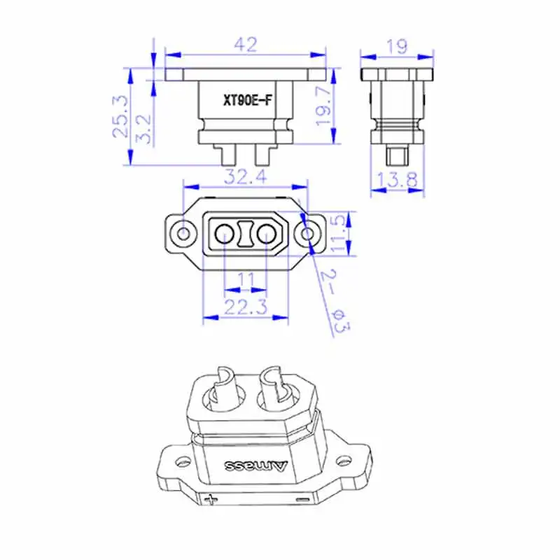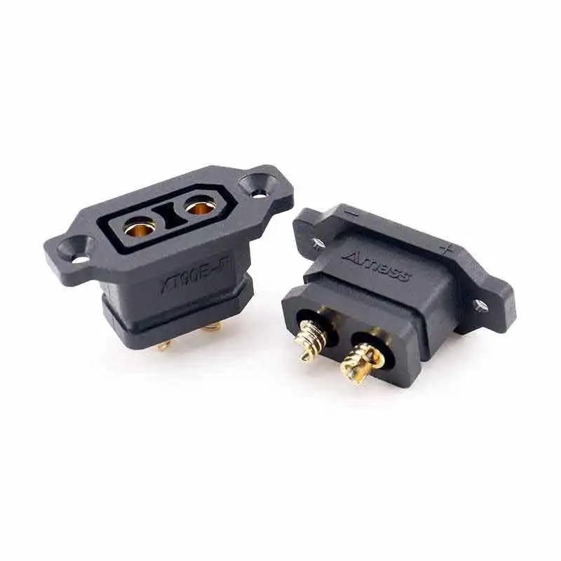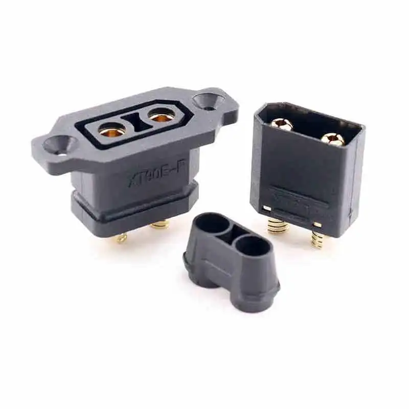 - The female XT90E-F socket features brass or gold-plated contact pins, designed to connect securely with the male connector, with mounting holes for easy installation on various devices.