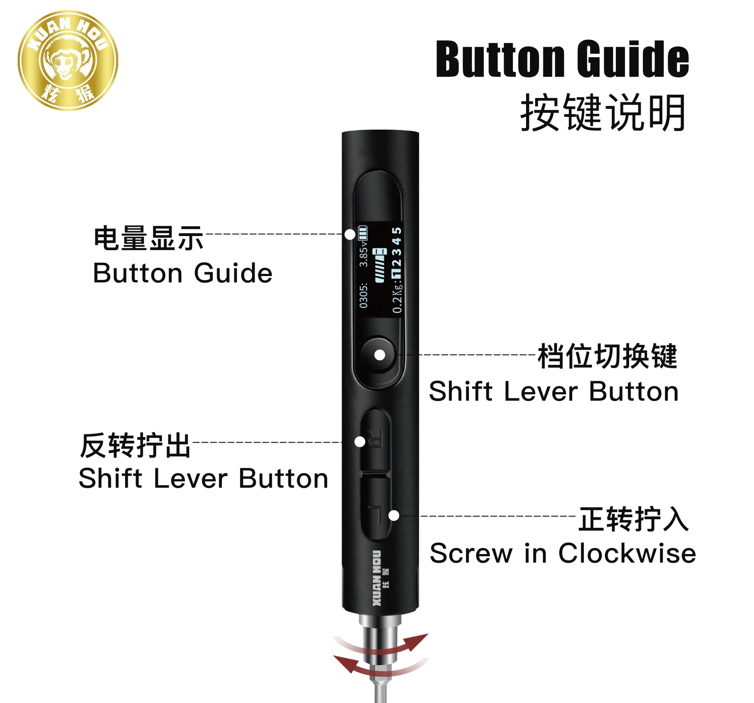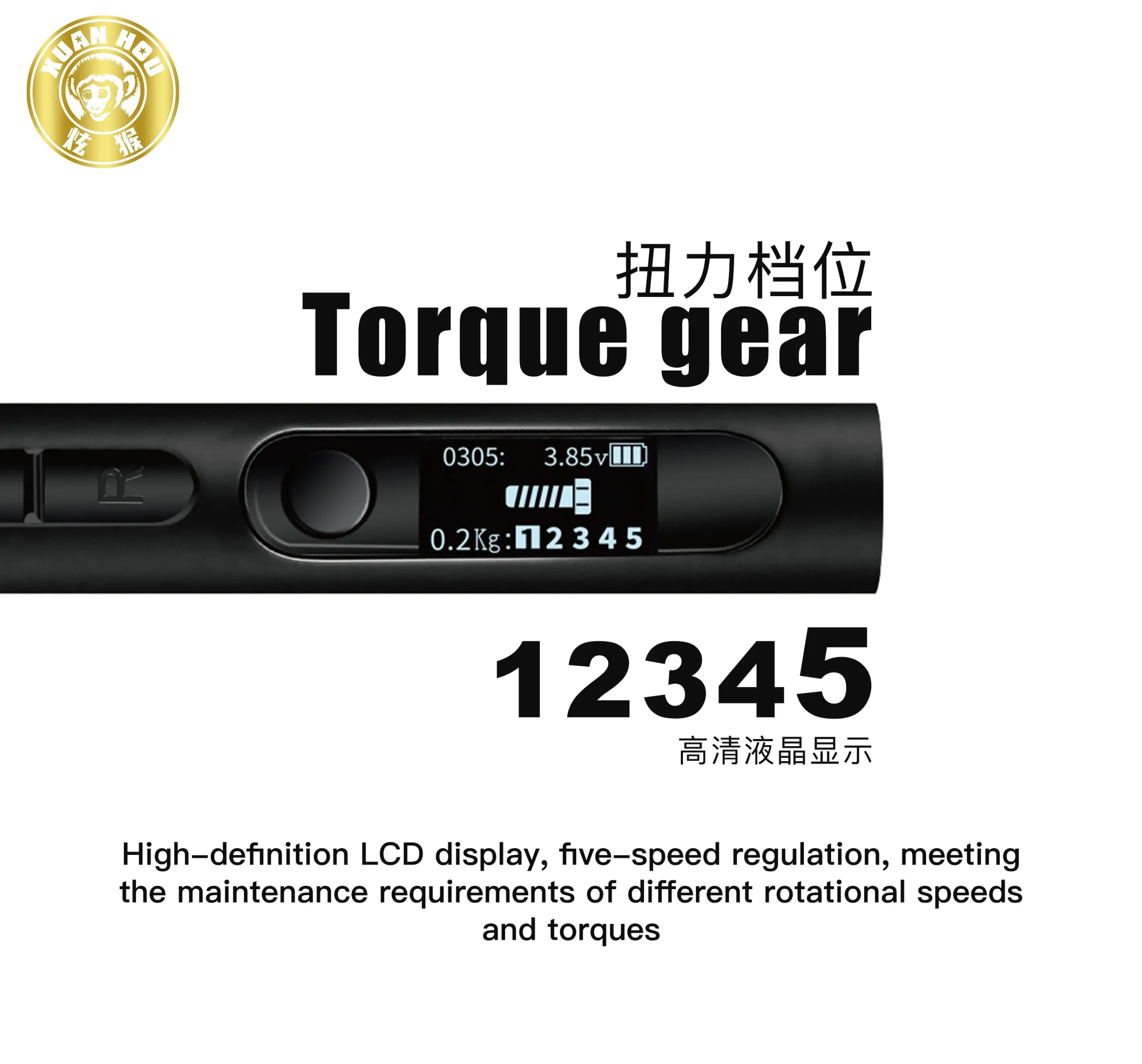 - High-tech LCD display shows real-time voltage (3.85V), adjustable torque level, and battery life, enhancing user confidence and control.