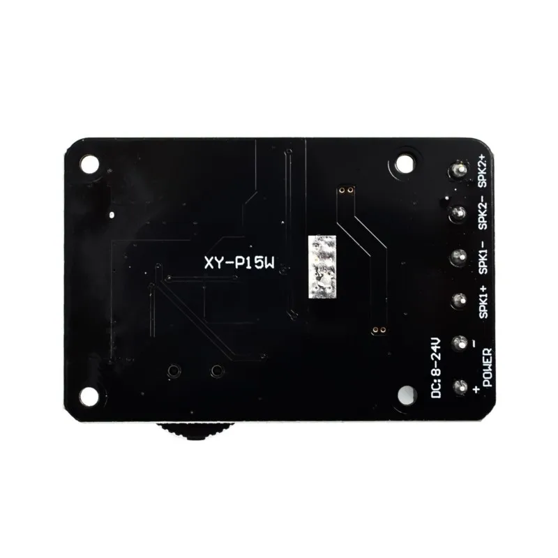 Experience high-quality stereo sound with this sleek, compact XY-P15W Bluetooth amplifier board. Crafted with a matte black finish, its modern design seamlessly blends into any audio setup. The organized surface-mount components, including resistors, capacitors, a central integrated circuit, and a metallic crystal oscillator, showcase precise engineering. The semi-circular heatsink not only ensures efficient thermal management but also adds a subtle metallic accent. The black terminal block provides easy wiring, while the overall layout promotes simplicity and professionalism. Whether you're building a home audio system or upgrading an existing speaker, this amplifier promises reliable, high-power performance in a small footprint. Its sturdy construction and aesthetic appeal make it a trusted choice for audio enthusiasts who demand quality and style in one package.