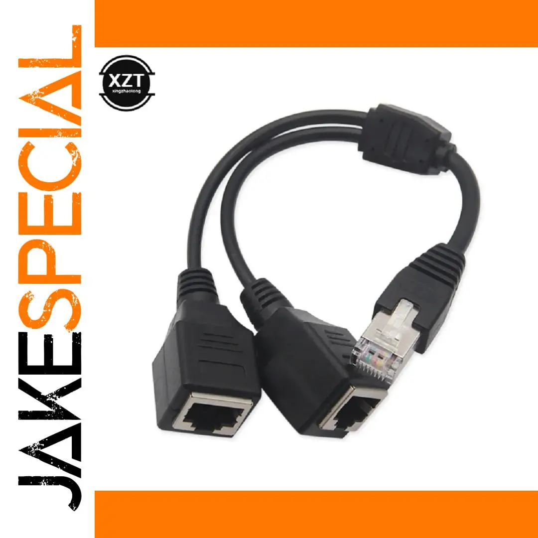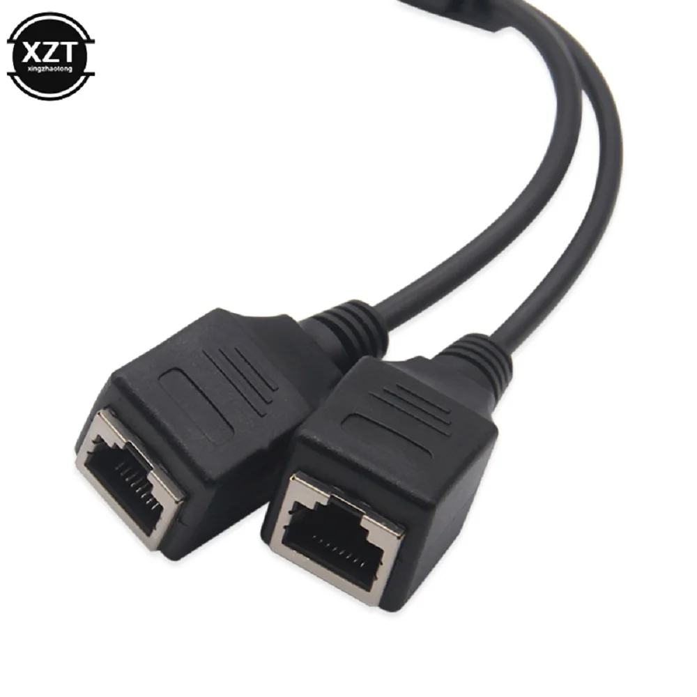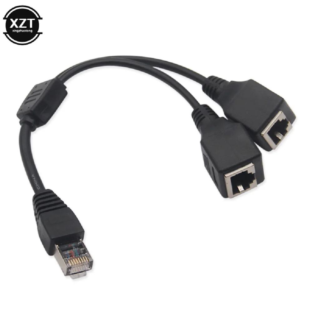 Enhance your network setup with this durable Y-shaped Ethernet splitter cable, featuring a black flexible rubber or plastic construction. It includes one male RJ45 connector with a transparent housing revealing internal contact pins, and two female RJ45 sockets enclosed in protective matte black casings, each with locking clips for secure connections. Designed to reliably extend your LAN Ethernet network, the splitter offers a compact and utilitarian style with stable data transmission capabilities. Ideal for seamless network expansion, this lightweight cable provides a straightforward solution for connecting multiple devices with ease and confidence.