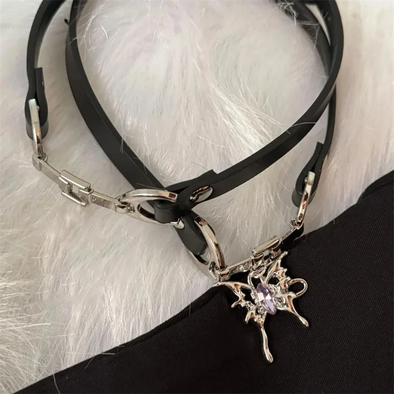 Experience the bold and edgy style of this this Y2K punk leather choker necklace, perfect for expressing your unique personality. Crafted with a sleek black leather band featuring a smooth matte finish and a subtle glossy sheen, it offers a refined yet rebellious look. The sturdy metallic clasp, finished in shiny silver-tone, adds a polished contrast to the leather. Dangling from the clasp is a captivating butterfly pendant with jagged wings and cutouts, crafted in a silver or silver-tone metallic finish. The oval-shaped pink rhinestone in the center adds a vibrant touch of femininity. This versatile accessory seamlessly blends goth, vintage Y2K, and punk styles, making it ideal for parties, concerts, or everyday fashion statements. Its adjustable design ensures a comfortable and secure fit for women looking to enhance their wardrobe.