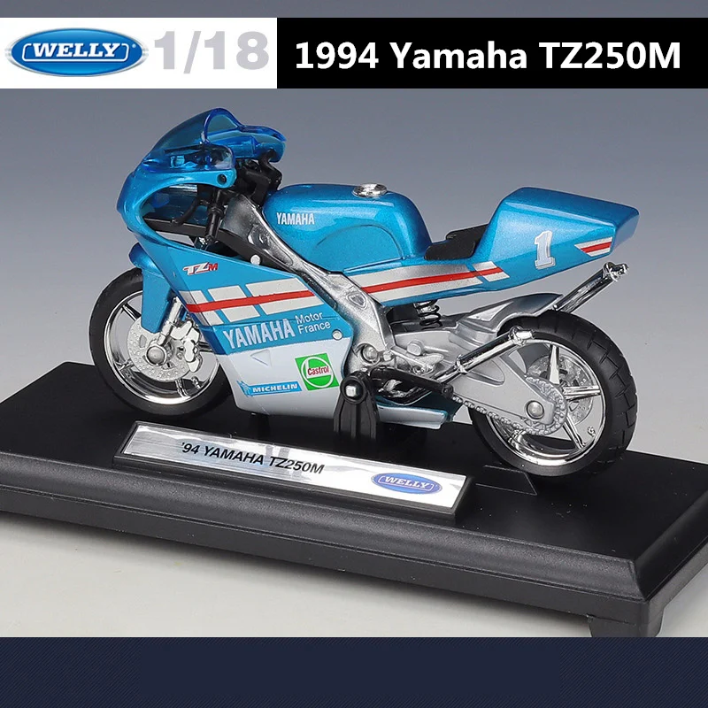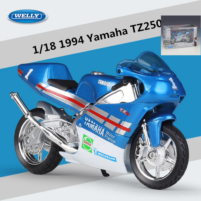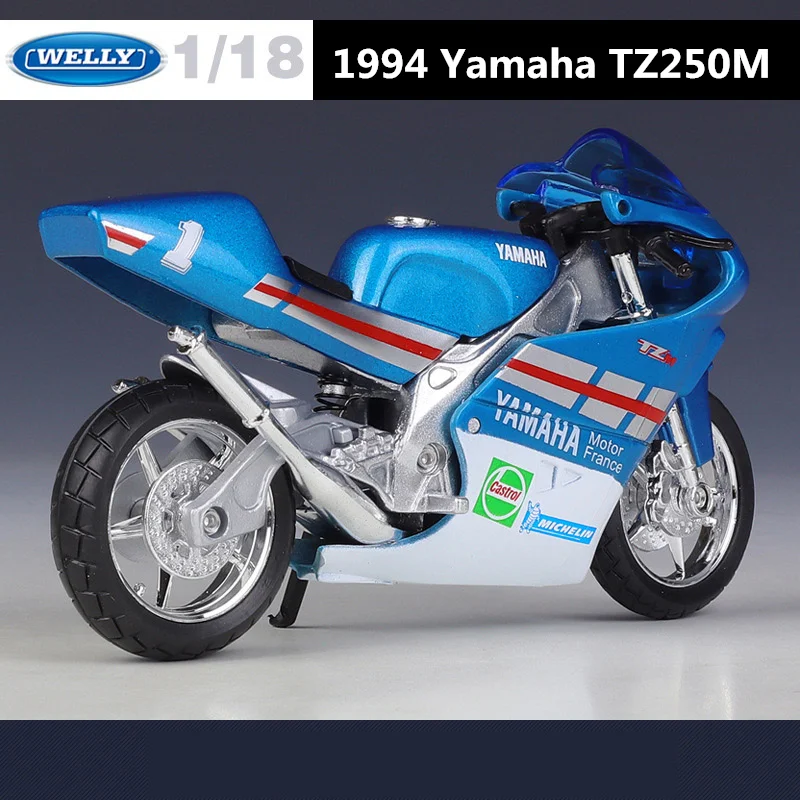 Immerse yourself in the thrill of motorcycle racing with this meticulously crafted 1:18 scale Yamaha TZ250M diecast model. Made from alloy and plastic, it captures every detail of the original racing machine, from the sleek, aerodynamic front fairing in metallic blue accented with white, red, and black elements to the finely molded exhaust pipes and textured black seat. The model features realistic rubber tires with tread patterns, detailed suspension components, and a compact tail section that highlights the sporty and energetic design. Perfect for passionate collectors, it brings the high-speed world of Yamaha racing into your display. Its superb craftsmanship and authentic aesthetics make it a captivating addition to any collection or display shelf.