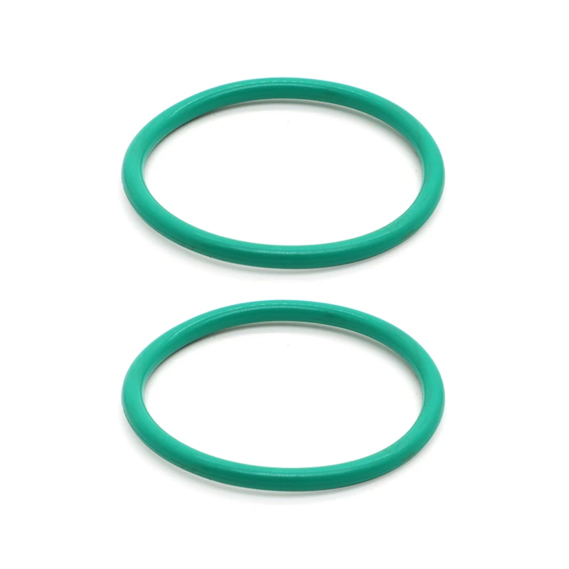 - Two bright green O-rings, made from flexible rubber, designed for sealing exhaust connections to prevent exhaust leaks and ensure optimal engine efficiency.