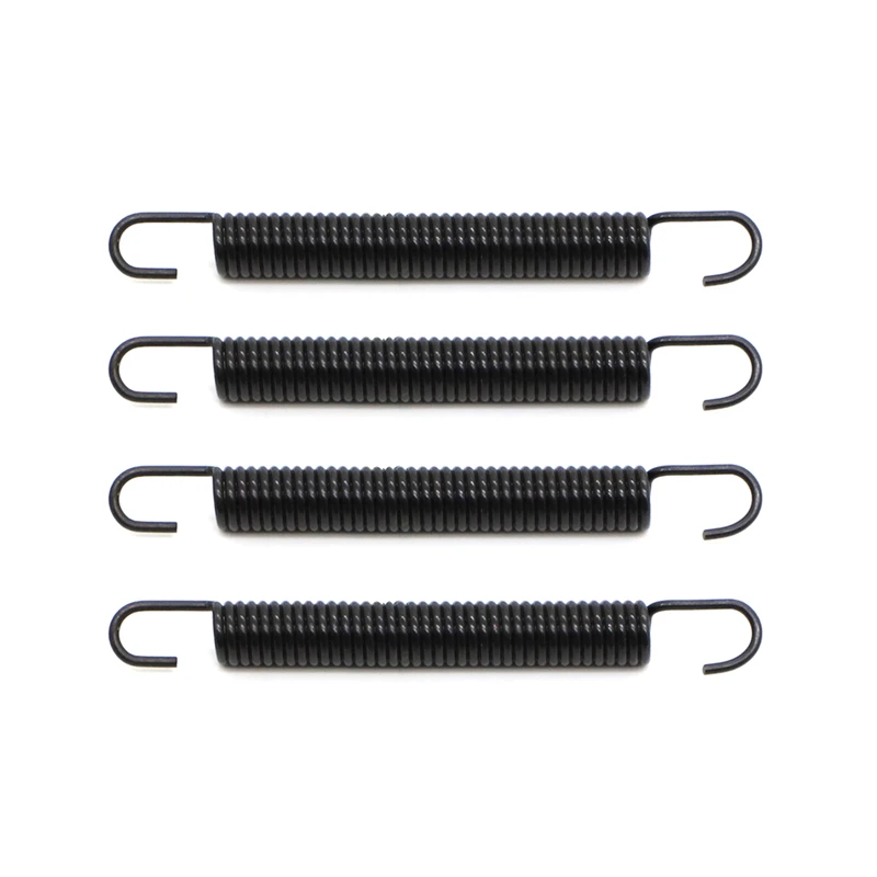- Set includes four black metal springs, each coiled for high stress resilience and durability, with hooks at both ends, curved outward at the top for secure attachment.