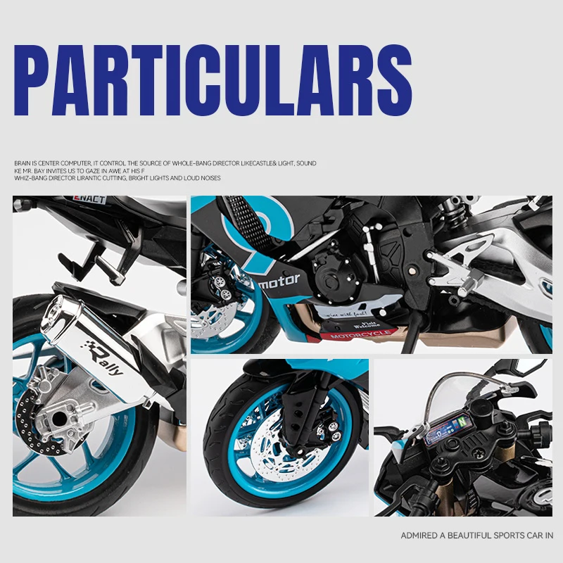 Step into the world of motorcycle enthusiasts with this exquisite Yamaha YZF R1M diecast model, scaled at 1:10. Carefully crafted from durable metal, it boasts a vibrant blue finish with white and silver accents, capturing the essence of the high-performance racing bike. The aerodynamic fairing, detailed engine components, textured tires, and realistic suspension elements give the model a striking authenticity. Its glossy surfaces and precise decals, including racing numbers and sponsor logos, enhance its visual appeal. Powered by a button battery electric mechanism, this model combines craftsmanship with functionality. Whether displayed on a shelf or used as a collectible gift, it embodies the spirit of racing and fine modeling craftsmanship.