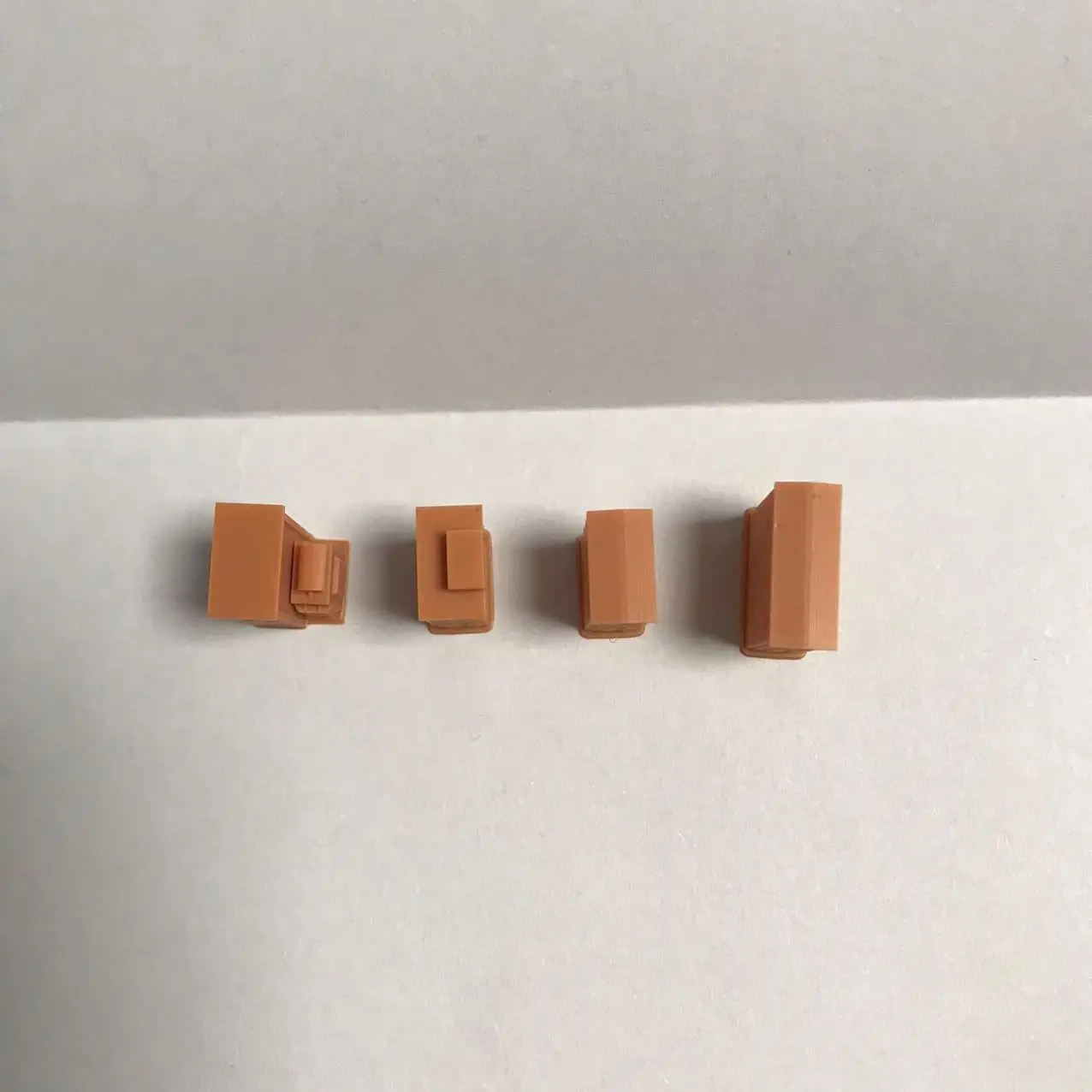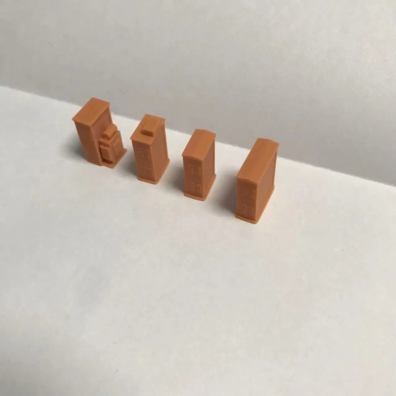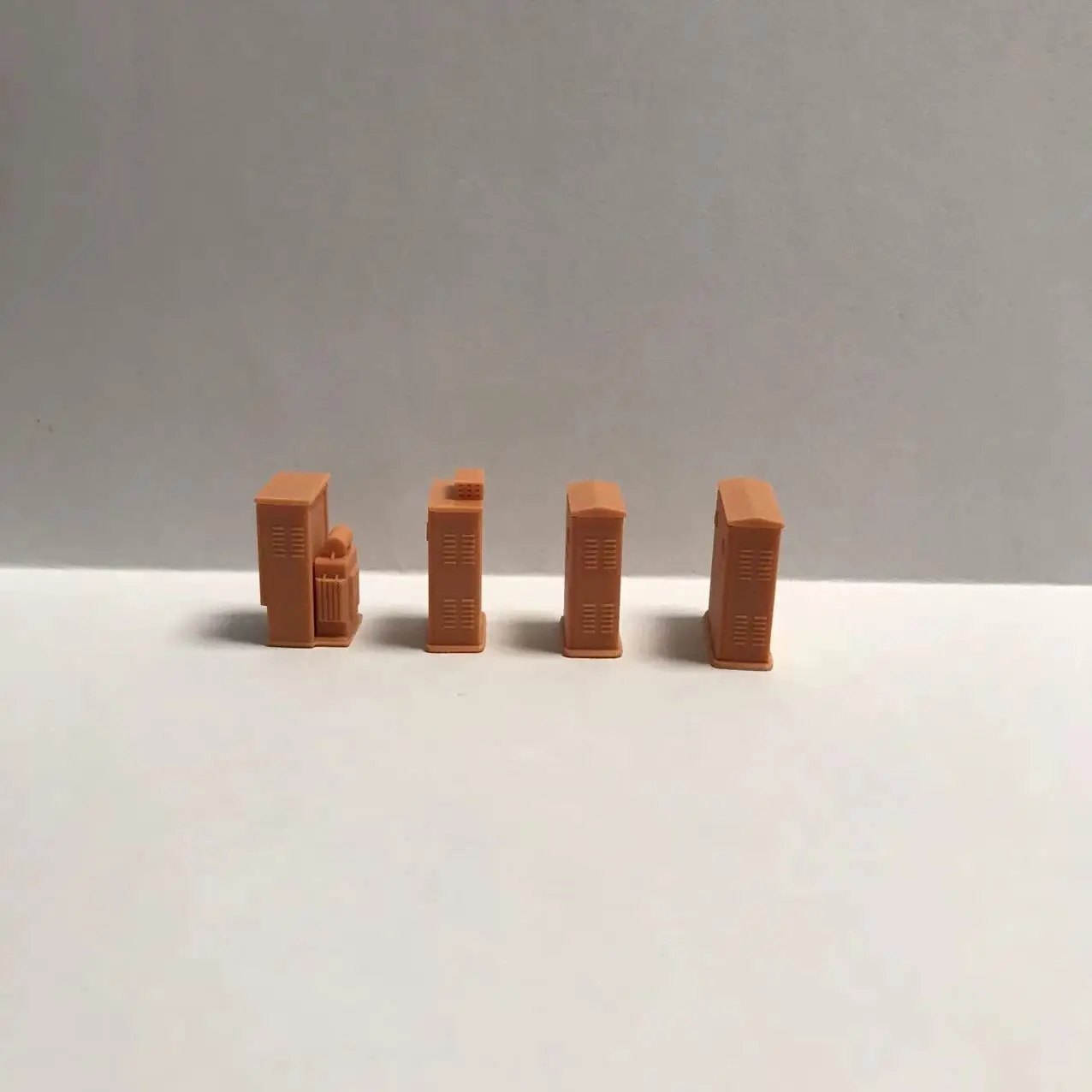 This set features four meticulously crafted miniature power transformer cabinets designed specifically for model railroad displays. Made from high-quality gray or light-colored resin, each cabinet showcases a sleek rectangular form with a flat top. The front face contains two rounded doors, a central handle, and a caution symbol, enhancing the visual realism of the display. Subtle ventilation details and panel lines accentuate the sides of the cabinets, while one taller model features an intricate grid-like top for added detail. Available in a scale of 1:35, 1:72, and 1:87, these transformer boxes are perfect for enthusiasts seeking to elevate their model setups.