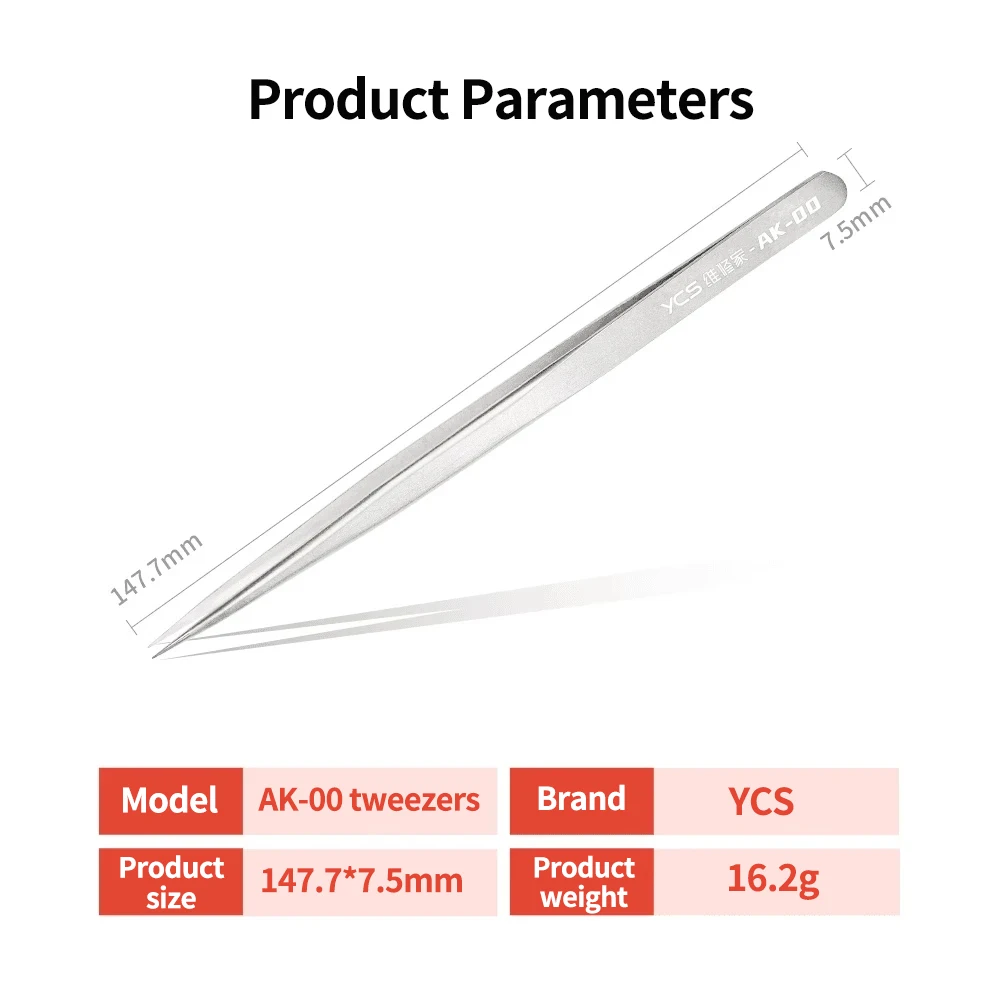 Experience unmatched precision with this set of YCS AK-00 precision pointed tweezers, expertly designed for delicate electronic repairs. Crafted from high-quality stainless steel, these tweezers measure approximately 147.7mm in length and weigh just 16.2 grams, offering a lightweight yet durable tool. The slim, elongated profile features sharply pointed tips, perfectly suited for gripping tiny components such as chips, screws, and flying wires on mobile phone motherboards. The transparent PVC silicone sleeves fitted on the tips enhance safety and prevent damage during handling. Ergonomically designed for comfort, these tweezers allow you to work with greater control and less fatigue, making intricate repairs more manageable. Their seamless fit ensures stable clamping, turning complex tasks into effortless precision work.