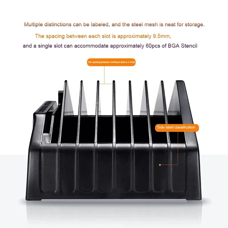 - Neatly aligned slots with 9.5mm spacing, each capable of holding approximately 60 BGA stencils, ideal for keeping your tools and parts sorted without cluttering your workspace.