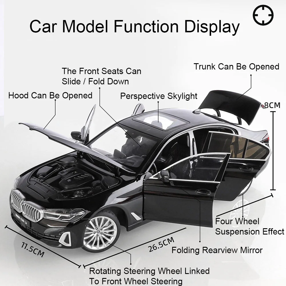 - Technical specifications include a 1:18 scale, CE certification, non-electric operation, and dimensions of approximately 27x12x7.3 cm or 26.5×11.5×8 cm for the 530LI version, ensuring high simulation quality.