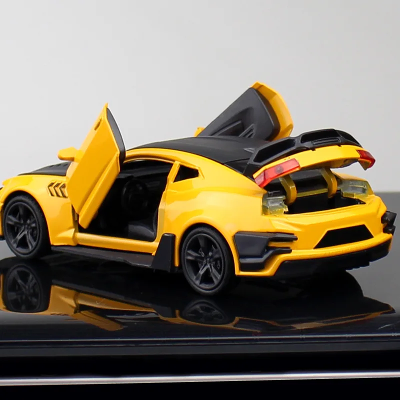 Experience the thrill of owning this highly detailed diecast model of a Chevrolet Camaro, scaled at 1:36. With its striking yellow matte or semi-gloss finish, it captures the aggressive and sporty spirit of modern muscle cars. The sleek, aerodynamic body features smooth curves, sharp angles, and intricate sculpted details like a prominent front splitter and hood vents, adding to its realism. The narrow, angular headlights and contrasting black accents on the bumper and lower edges create a bold look. Multi-spoke black wheels with low-profile tires enhance its high-performance appearance, while the open gullwing-style doors and streamlined side mirrors give a dynamic sense of motion. It’s perfect for collectors or car enthusiasts looking to showcase or add to their display.