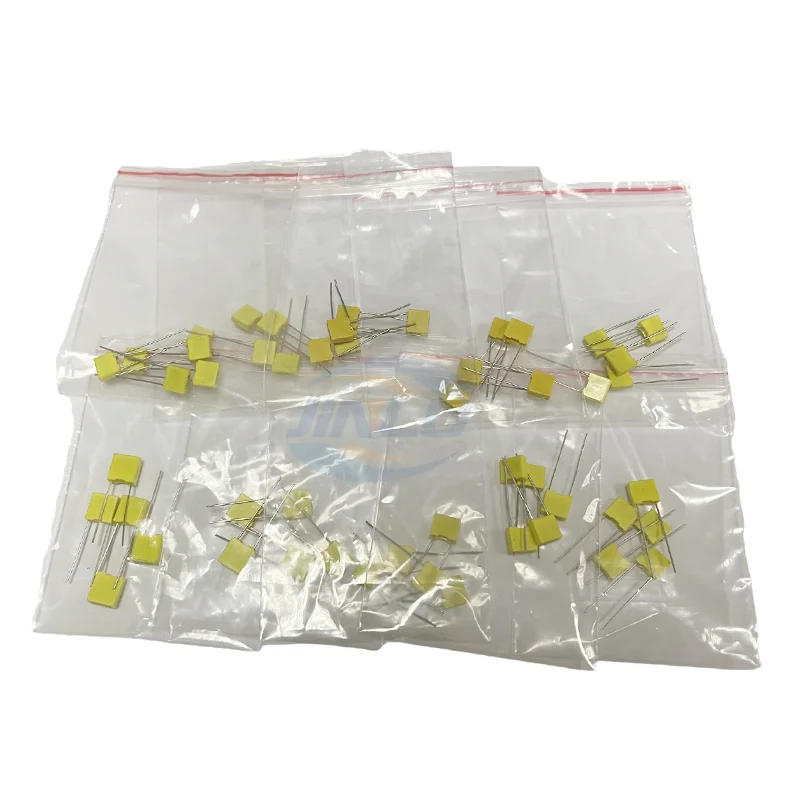 - Each value features five units with capacitance ratings: 102J, 152J, 332J, 472J, 103J, 333J, 473J, 104J, 224J, and 474J, ensuring versatile usage.