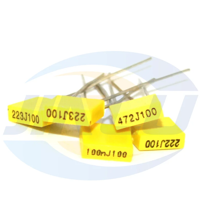 - Technical specifications include a maximum voltage of 100V, precise capacitance values, and a durable, standardized rectangular form with two metal leads for easy soldering.