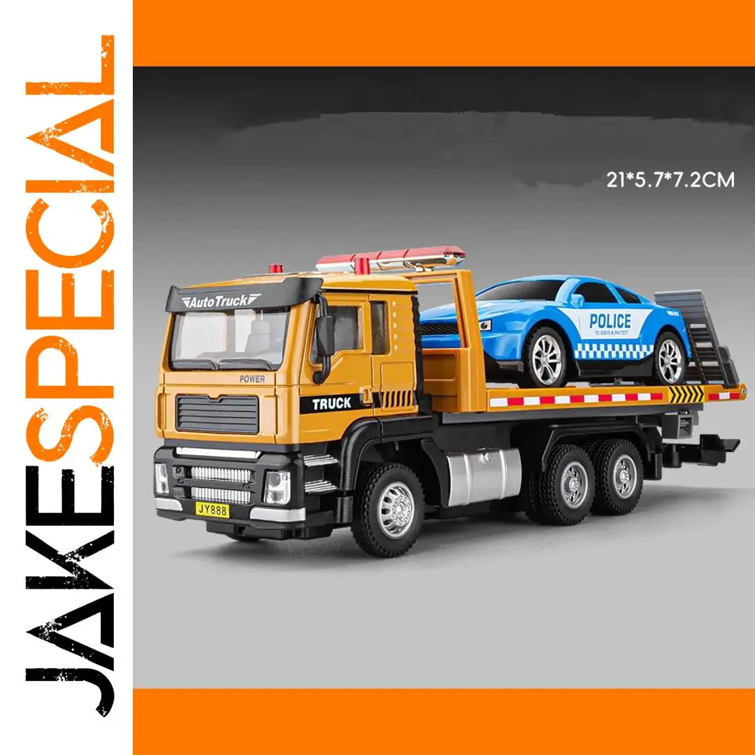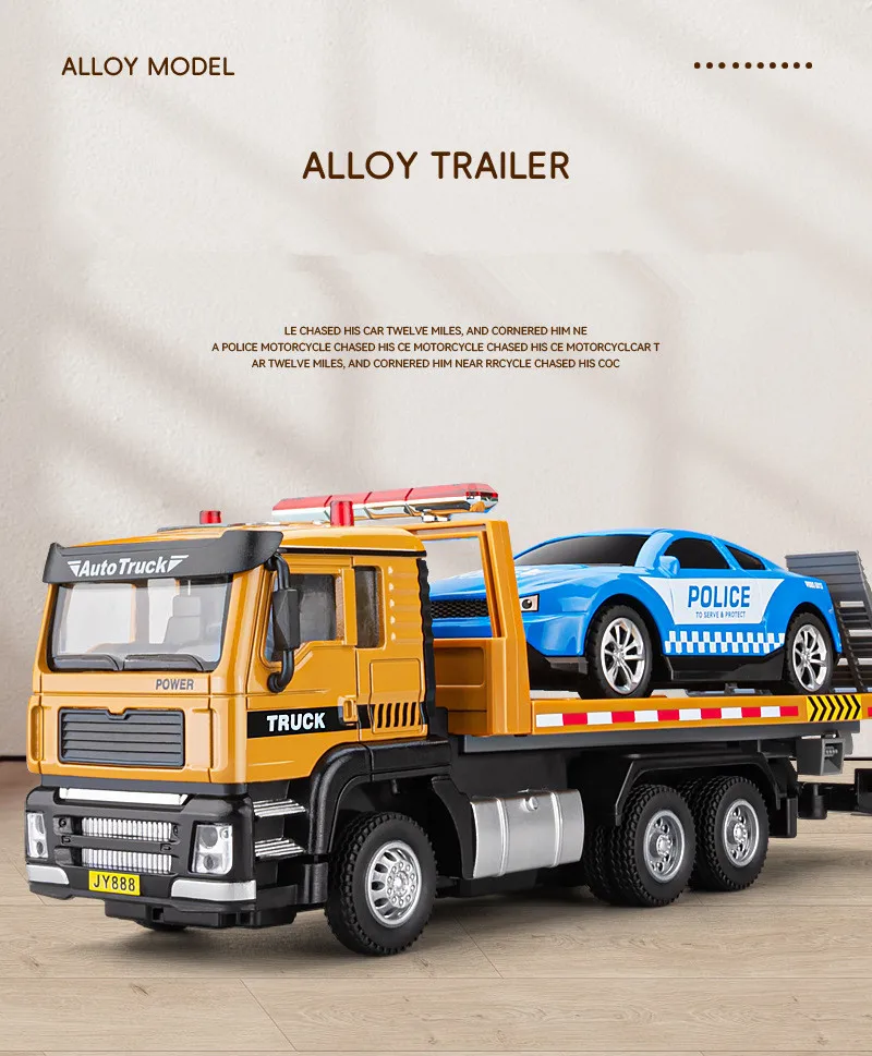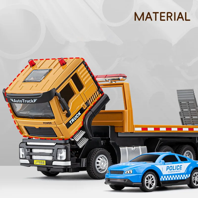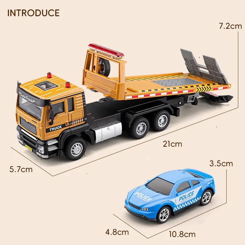Experience realism with this 1:50 scale alloy pull-back flatbed transport vehicle, measuring 21 cm in length, 7.2 cm in width, and 5.7 cm in height. Crafted from sturdy diecast alloy with plastic components, it features a bright yellow alloy front body, black and gray accents, and detailed rubber tires with realistic rims. The black flatbed boasts a textured platform, designed to transport other toy cars, including a sleek blue police vehicle with white checkered decals, silver alloy wheels, and a light bar. Operating via a lithium battery (not included), this durable model offers simulated sound and light features, perfect for display or interactive play.