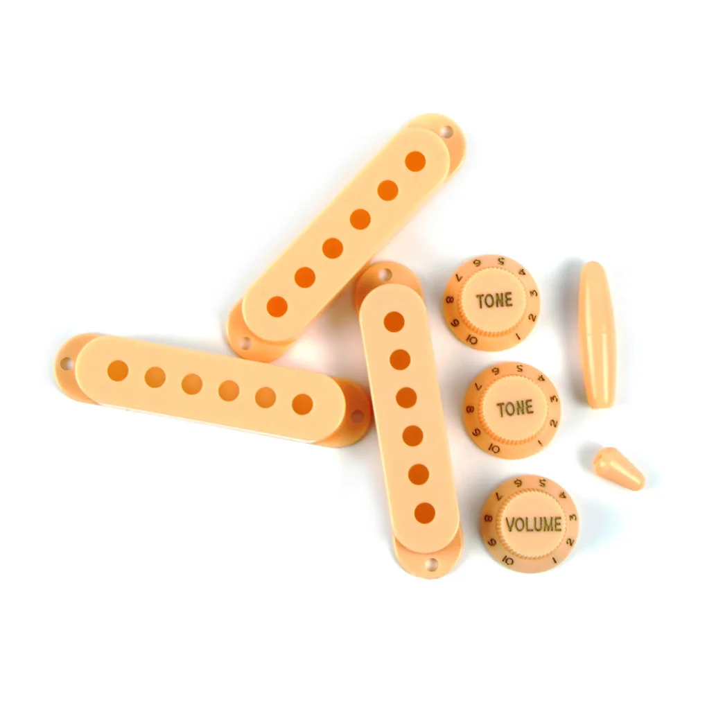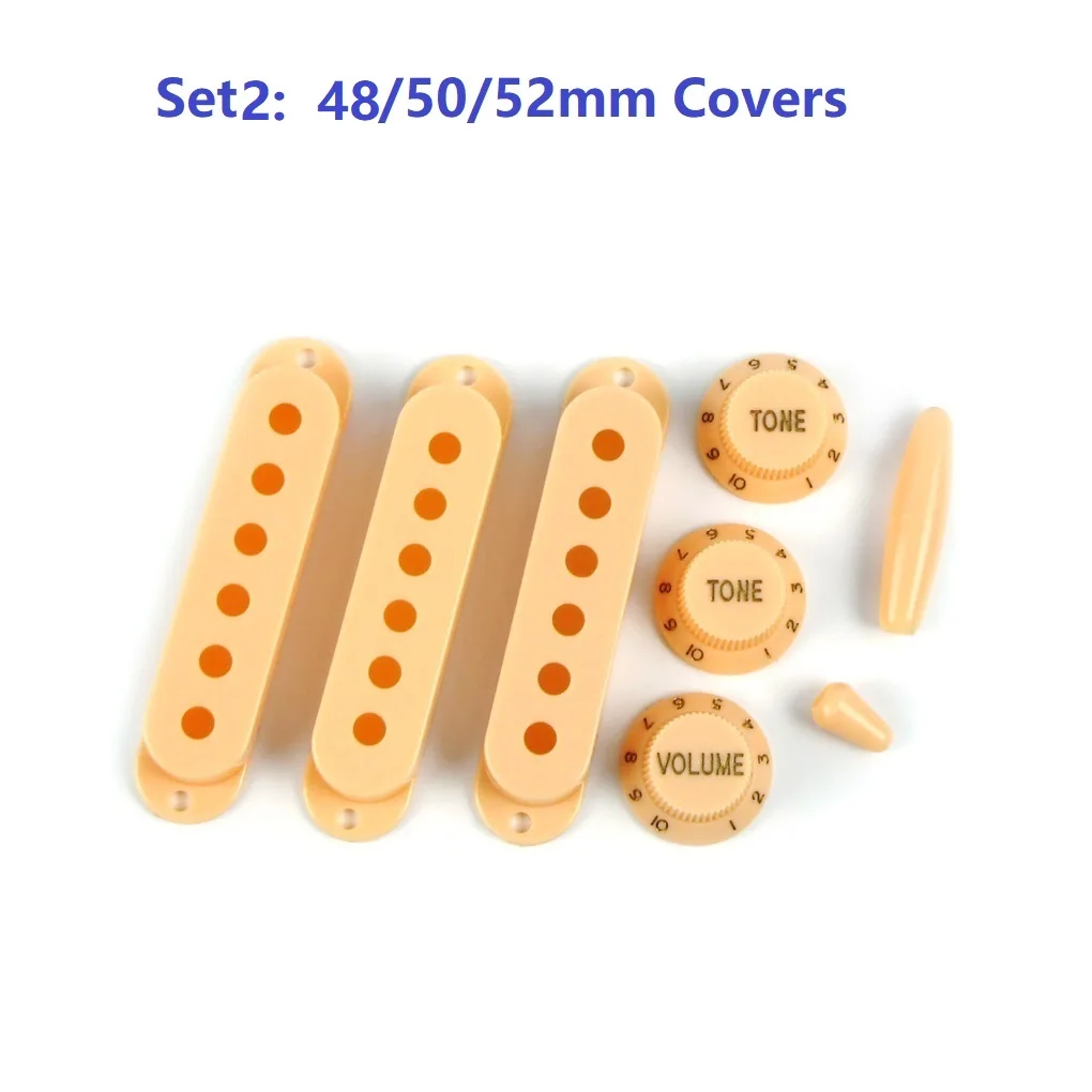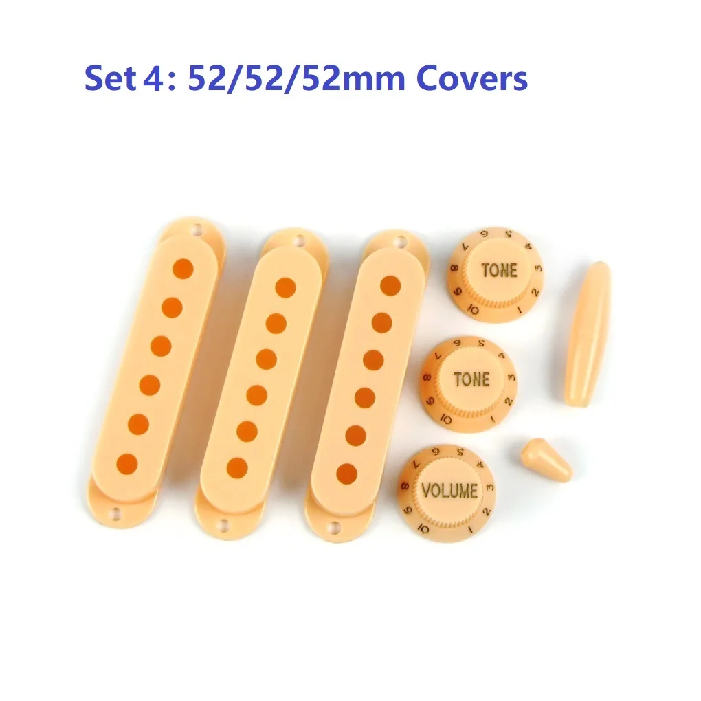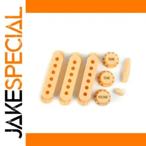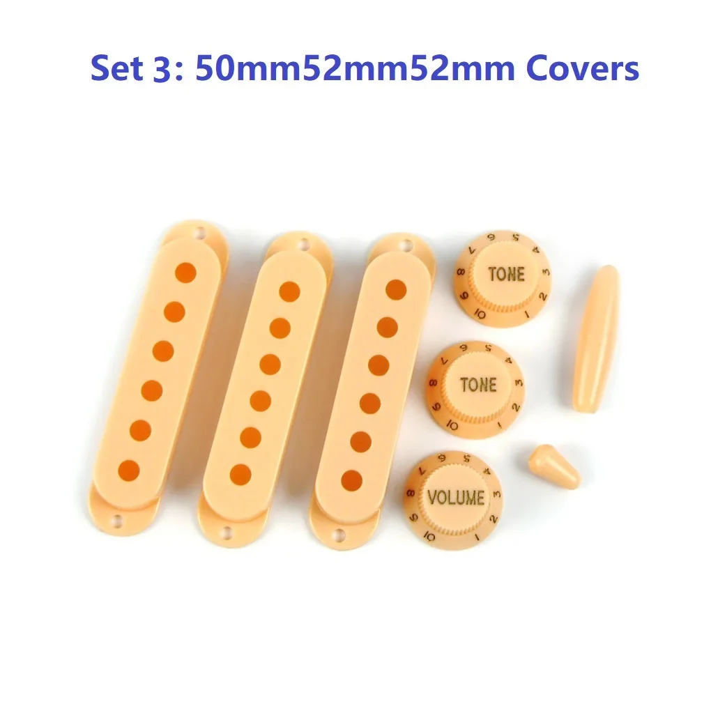 Enhance your guitar customization with this vibrant yellow accessory set, including three high-quality plastic pickup covers available in four configurations (48mm, 50mm, and 52mm), one volume knob, two tone knobs with engraved markings, a 5-way switch tip, and a whammy bar tip with approximately 5mm internal diameter. Designed specifically for FD style guitars or similar replacements based on pole spacing, these durable components feature a sleek, smooth finish and a lively color that adds a cheerful, energetic touch to your instrument. Perfect for upgrades or repairs, this set combines style and functionality for an improved playing experience.
