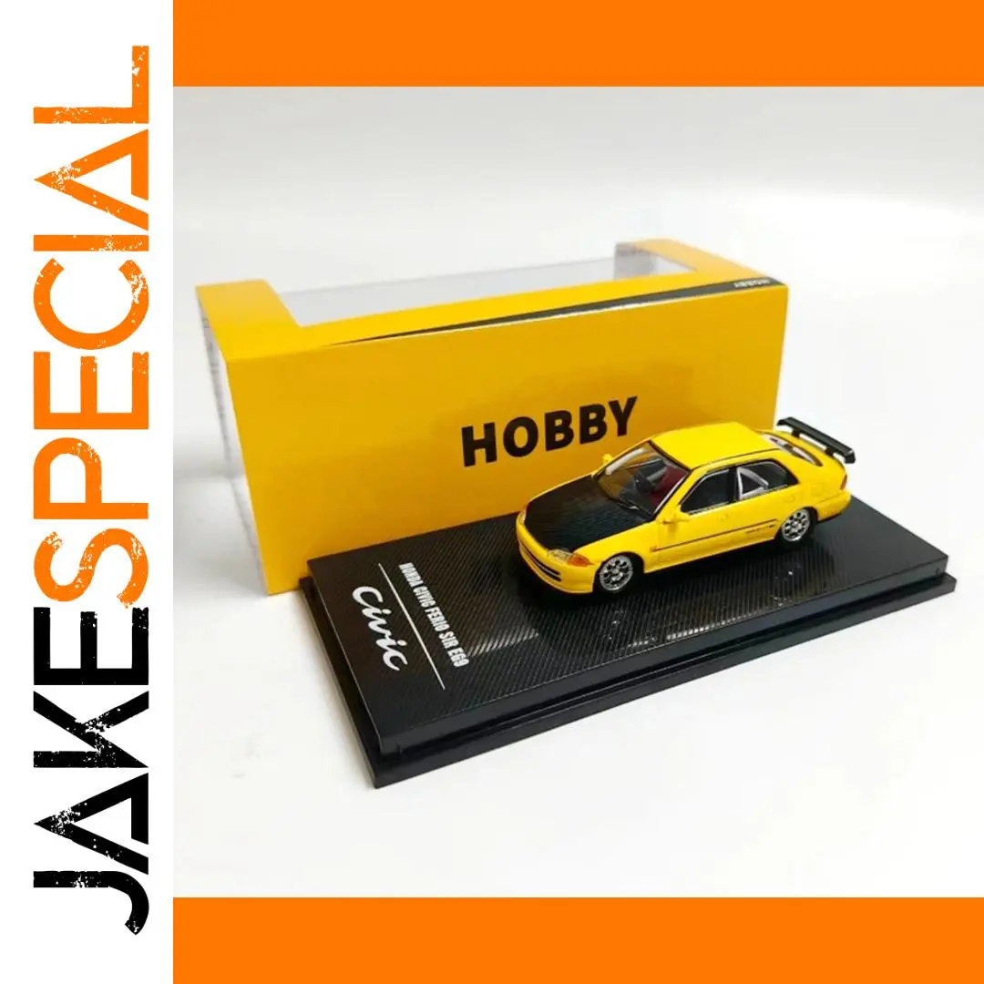 Imagine adding this eye-catching, finely crafted diecast model of the Honda Civic Ferio SIR EG9 to your collection, bringing a vibrant splash of color and sporty elegance to your display. With its bold yellow body accented by black details on the hood and rear spoiler, this compact replica captures the essence of the iconic EG9 design. The detailed front grille, headlights, side mirrors, and rear wing spoiler emphasize its aerodynamic, racing-inspired style. Resting on a textured black display base with a carbon fiber pattern, the model radiates sophistication and craftsmanship. Perfect for enthusiasts and collectors, this item transforms any space into a tribute to automotive excellence and sporty design, making your collection truly stand out.