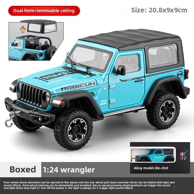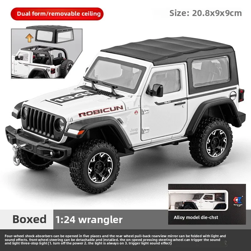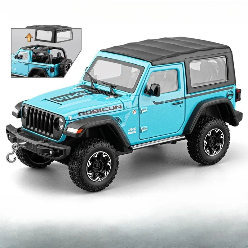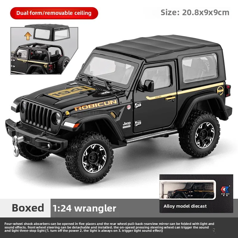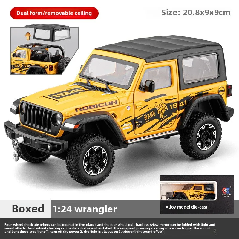 Experience the rugged charm of this 1:24 scale diecast Jeep Wrangler model, featuring a durable metal alloy shell with a vibrant metallic yellow finish and black accents. The realistic design includes detailed ABS plastic interior with seats and dashboard, and textured rubber tires mounted on black and silver alloy wheels, capturing off-road authenticity. Measuring 20.8 x 9 x 9 cm, this model is equipped with LED lights, sound effects, and a bottom switch for activation, making it a captivating display piece. Its high-quality construction, striking appearance, and authentic details make it the perfect collectible for adult enthusiasts and collectors.