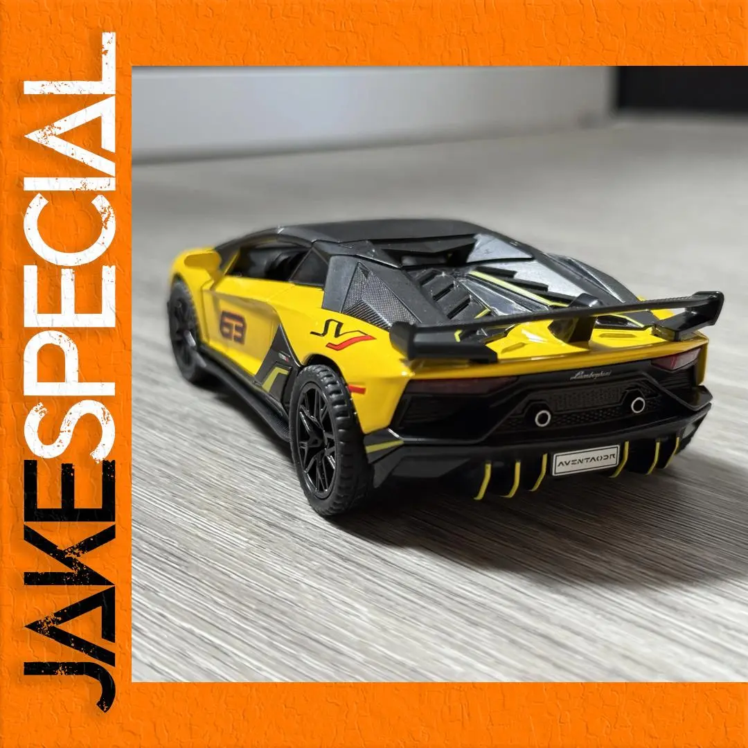 Experience the thrill of high-performance luxury with this meticulously crafted 1:32 scale diecast Lamborghini Aventador SVJ 63 model, featuring a vibrant yellow finish contrasted by matte black accents on the rear wing spoiler, roof, window frames, and side skirts. Made from high-quality alloy metal, it offers durability, realistic weight, and exceptional craftsmanship. Detailed components include textured tires on black multi-spoke rims, a silver engine cover, textured vents, and realistic taillights. The removable rear spoiler allows customization, making it an ideal display piece for adult collectors who appreciate precision engineering, striking aesthetics, and automotive excellence in a compact, premium model.