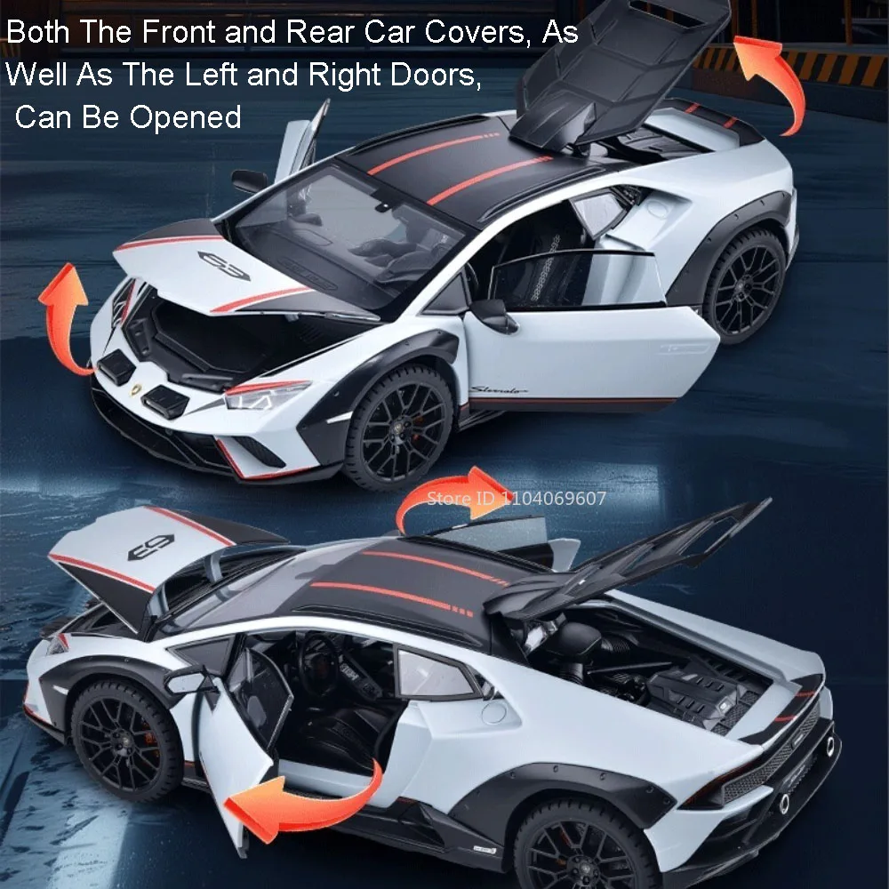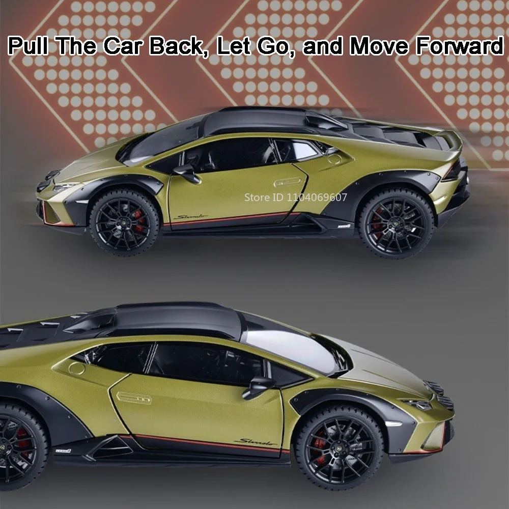 Experience the thrill of high-speed realism with this 1:24 scale high simulation car model, available in vivid colors such as yellow, orange, white, grey, green, purple, and brown. Crafted from a durable metal alloy body, plastic chassis, and rubber tires with shock absorption, this detailed replica measures approximately 20.5 x 9.5 x 5 cm for the Huracan and 21 x 9.5 x 5 cm for the Revuelto. Features include authentic sound and light effects, a pull-back mobility mechanism, and doors that open, bringing the model to life. Built to withstand rough play with excellent craftsmanship, it’s perfect for enthusiasts aged 14+.
