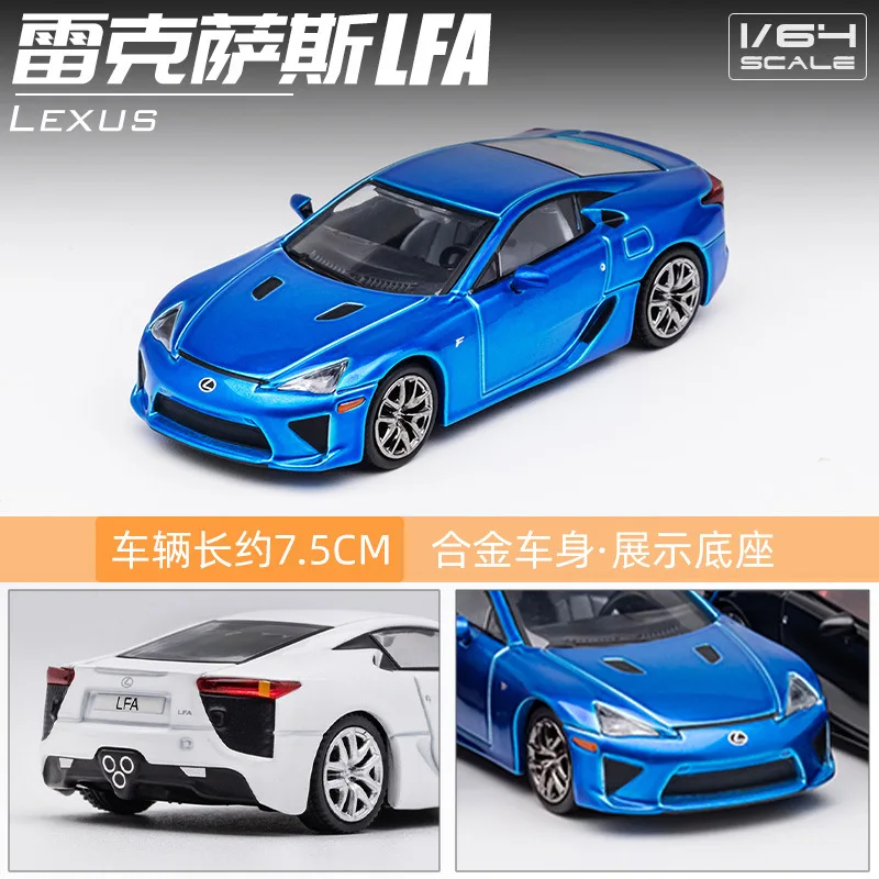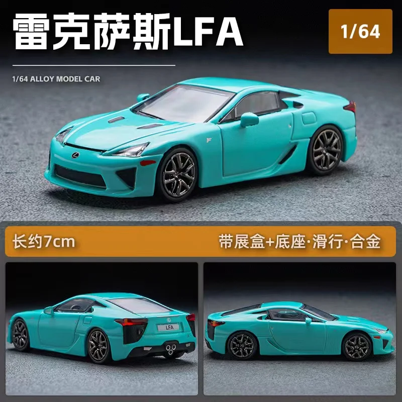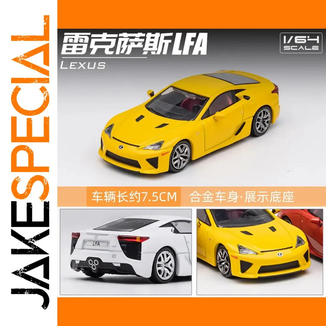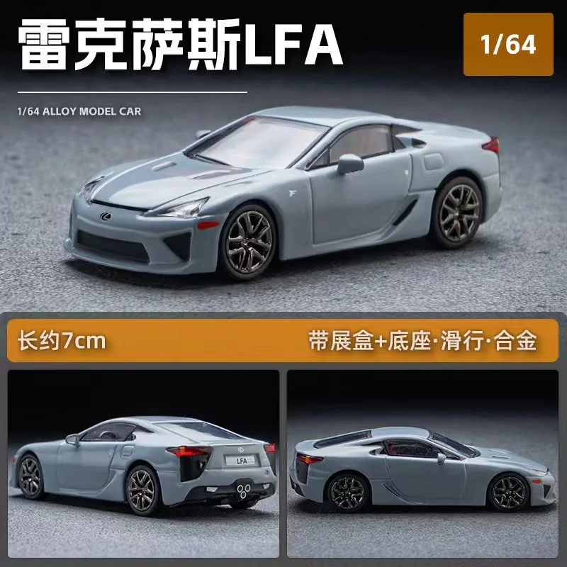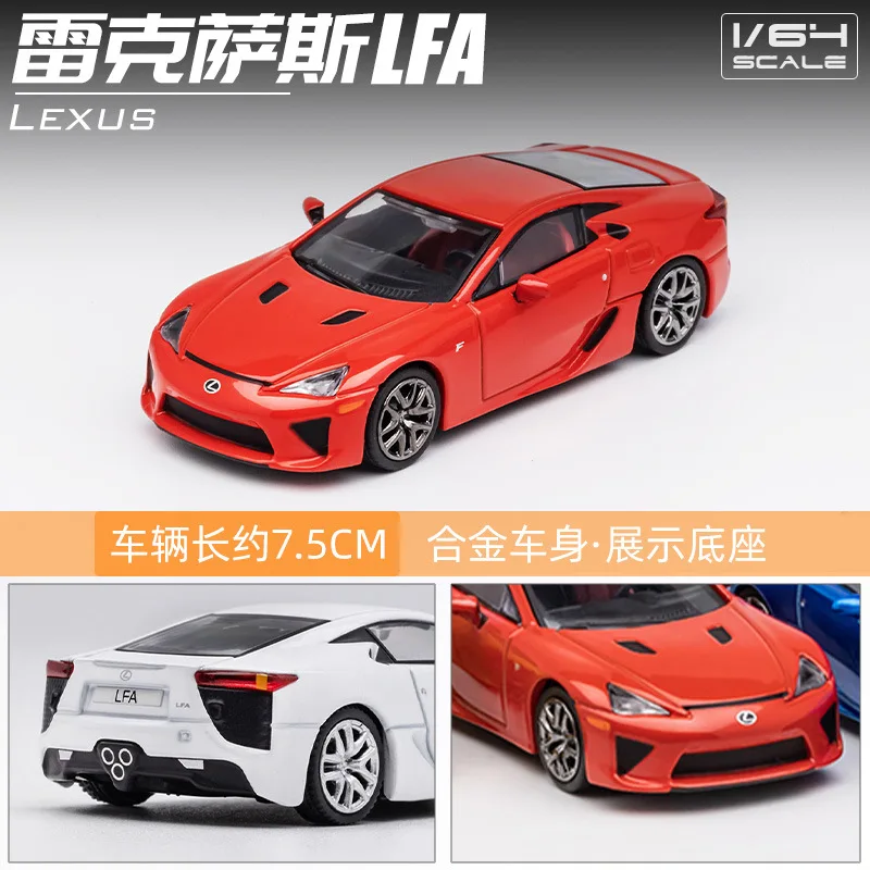 This highly detailed 1:64 scale diecast miniature replica of the Lexus LFA captures the sleek, sporty design with aerodynamic lines, sharp headlights, large air intakes, sculpted body panels, and a sloping roofline. Crafted from metal, it features multi-spoked silver alloy wheels with detailed treaded tires, narrow horizontal taillights, an integrated spoiler, and a rear diffuser with four exhaust pipes. Available in vibrant colors such as yellow, black, blue, burgundy, cement gray, gray, ice blue, lake blue, orange, red, silver, and white, this non-electronic display model is perfect for collectors, measuring approximately 7.5 centimeters in length and intended for adult enthusiasts.