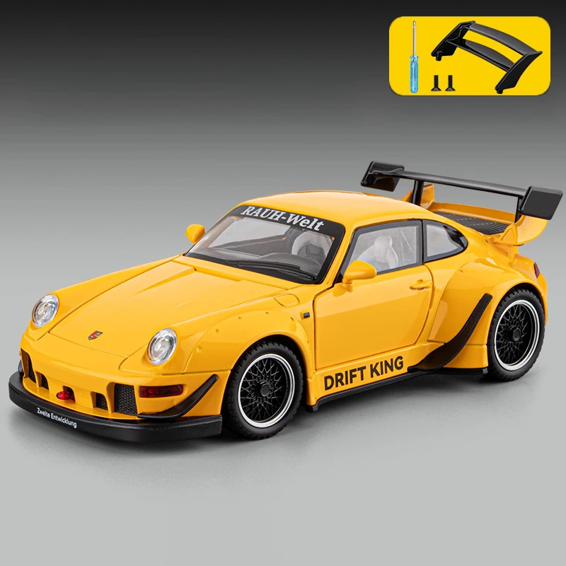 Experience the thrill of owning a miniature replica of a high-performance sports car with this meticulously crafted Porsche RWB 993 Targa 911 Supercar diecast model. Finished in a vibrant yellow hue, it captures the sleek, aerodynamic silhouette and aggressive racing aesthetic perfectly. From the detailed round headlamps and black accents to the powerful rear wing spoiler, every element exudes authenticity and style. The model’s alloy metal construction ensures durability and a premium feel, making it an excellent addition to any collection. Whether displayed on your desk or shelf, this model provides a stunning visual. Its sound, light functions, and pull-back capability bring the model to life, offering an immersive experience that elevates your collection’s authenticity and excitement.