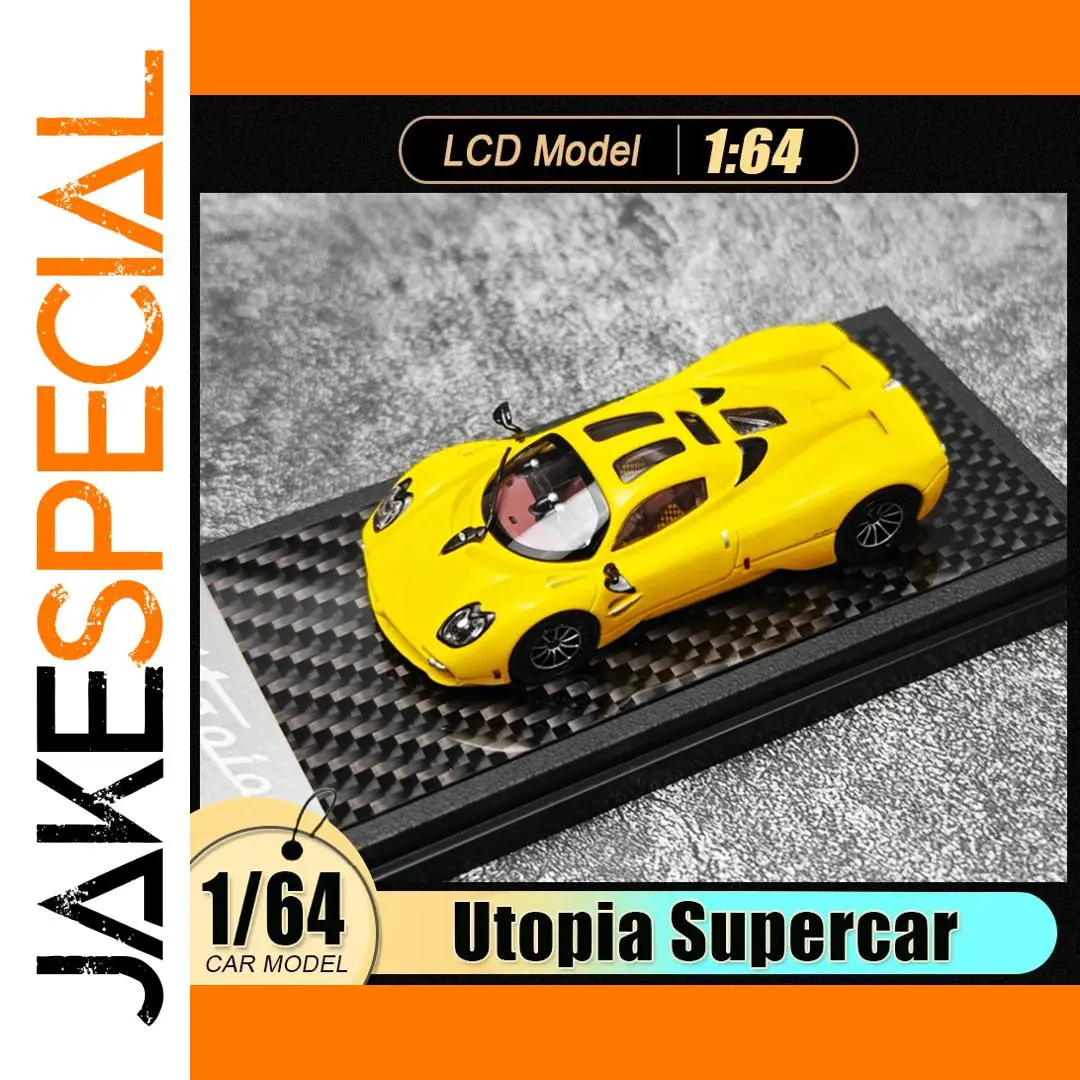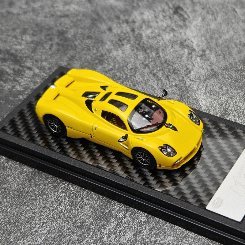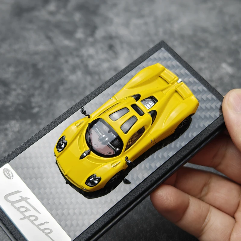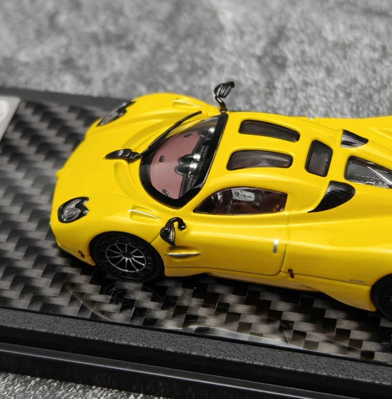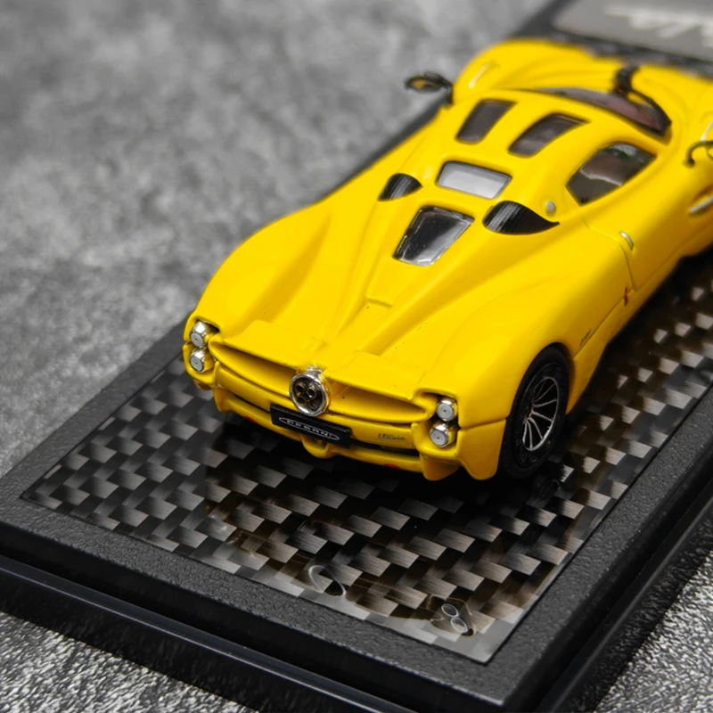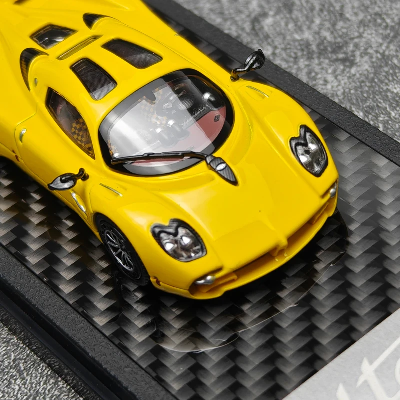 Discover this meticulously crafted 1:64 scale diecast model car in vibrant yellow, featuring a glossy finish that captures the sleek, aerodynamic lines of a high-performance supercar. Designed with intricate details such as black side mirrors, multi-spoke black wheels, transparent windows revealing a reddish interior, and three black vents on the roof, this collector’s piece exudes luxury and speed. It rests on a textured black carbon-fiber-like base, emphasizing its premium craftsmanship. Made from durable metal and suitable for ages 14 and up, this model is perfect for display and adds a touch of sporty elegance to any collection, making it an ideal holiday gift for enthusiasts.