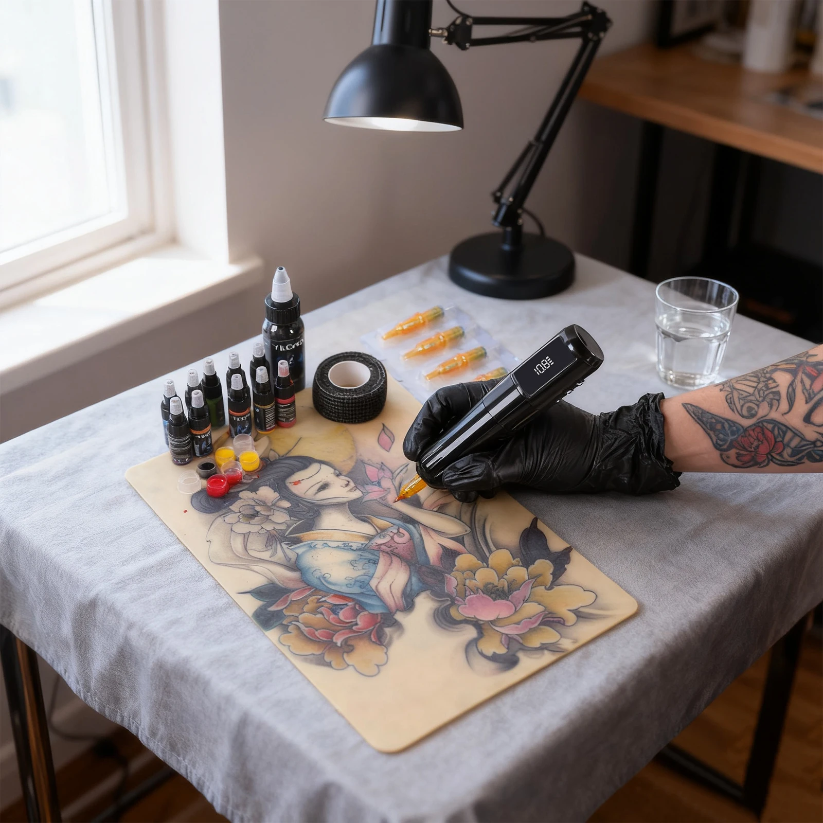 Experience professional tattooing with this wireless rotary tattoo kit featuring a sleek 3.5mm stroke pen design, a powerful 1600mAh rechargeable battery, and an intuitive LED screen for real-time monitoring. Perfect for beginners, the kit includes all essential tools, such as transparent ink caps, vibrant tattoo ink bottles in four color options—purple, yellow, orange, blue, red, and green— textured grip tape, disposable black gloves, a set of twelve high-quality needles with golden tips, and transfer gel. Its compact, portable design ensures ease of use on-the-go, offering a seamless tattooing experience with safety, precision, and style.