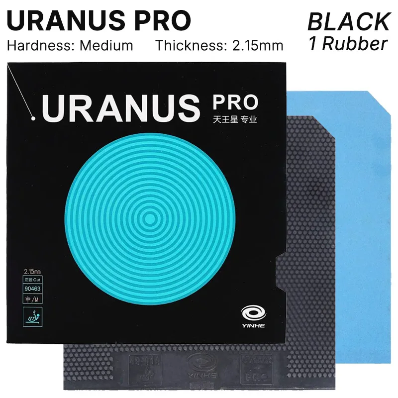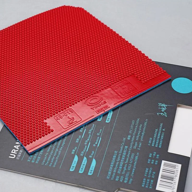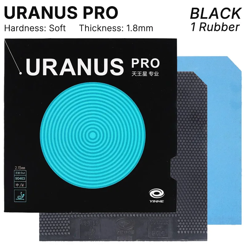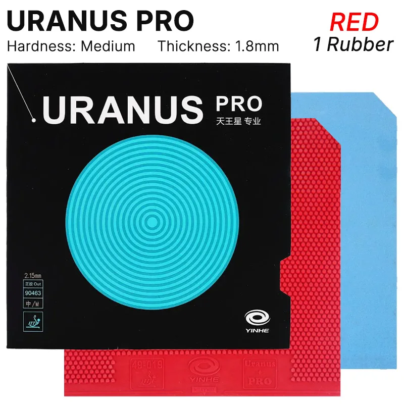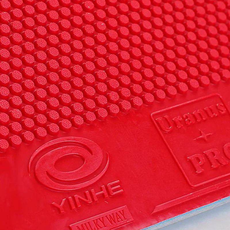 Experience explosive offensive play with the YINHE URANUS PRO Table Tennis Rubber, featuring pyramid-shaped pimples and a 2.15mm soft-medium sponge for enhanced speed (98), control (82), and spin (82). Designed for aggressive players, this ITTF-certified short pips rubber is optimized for 40+ plastic balls, offering maximum ball contact, rebound power, and adaptability. Available in black or red with hardness options of soft or mid, it boasts a sleek textured surface with densely packed, pyramid-shaped pimples arranged in a precise grid pattern, ensuring precise control and high performance at near-mid table. Weighing approximately 56 grams, it’s perfect for modern, fast-paced offensive styles.