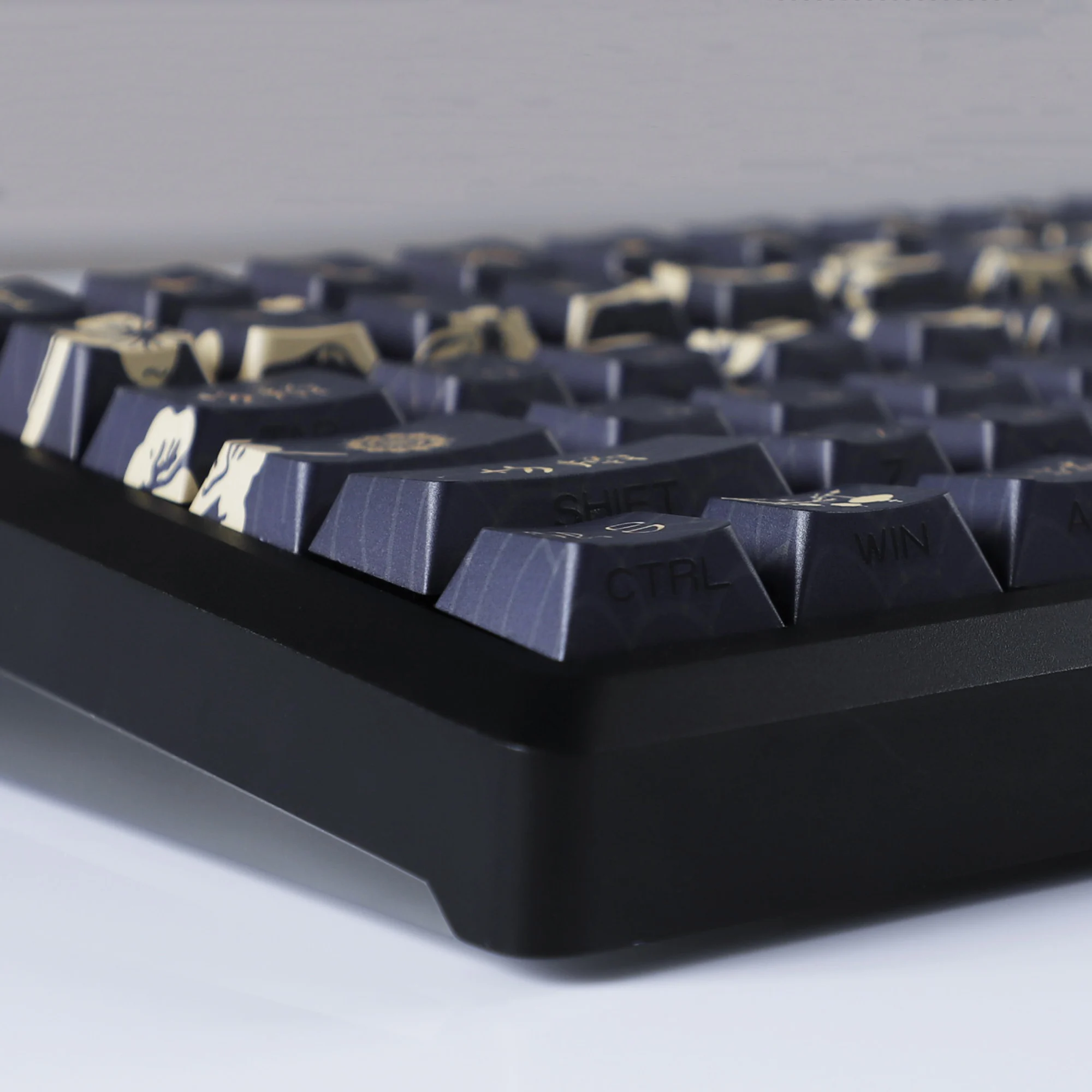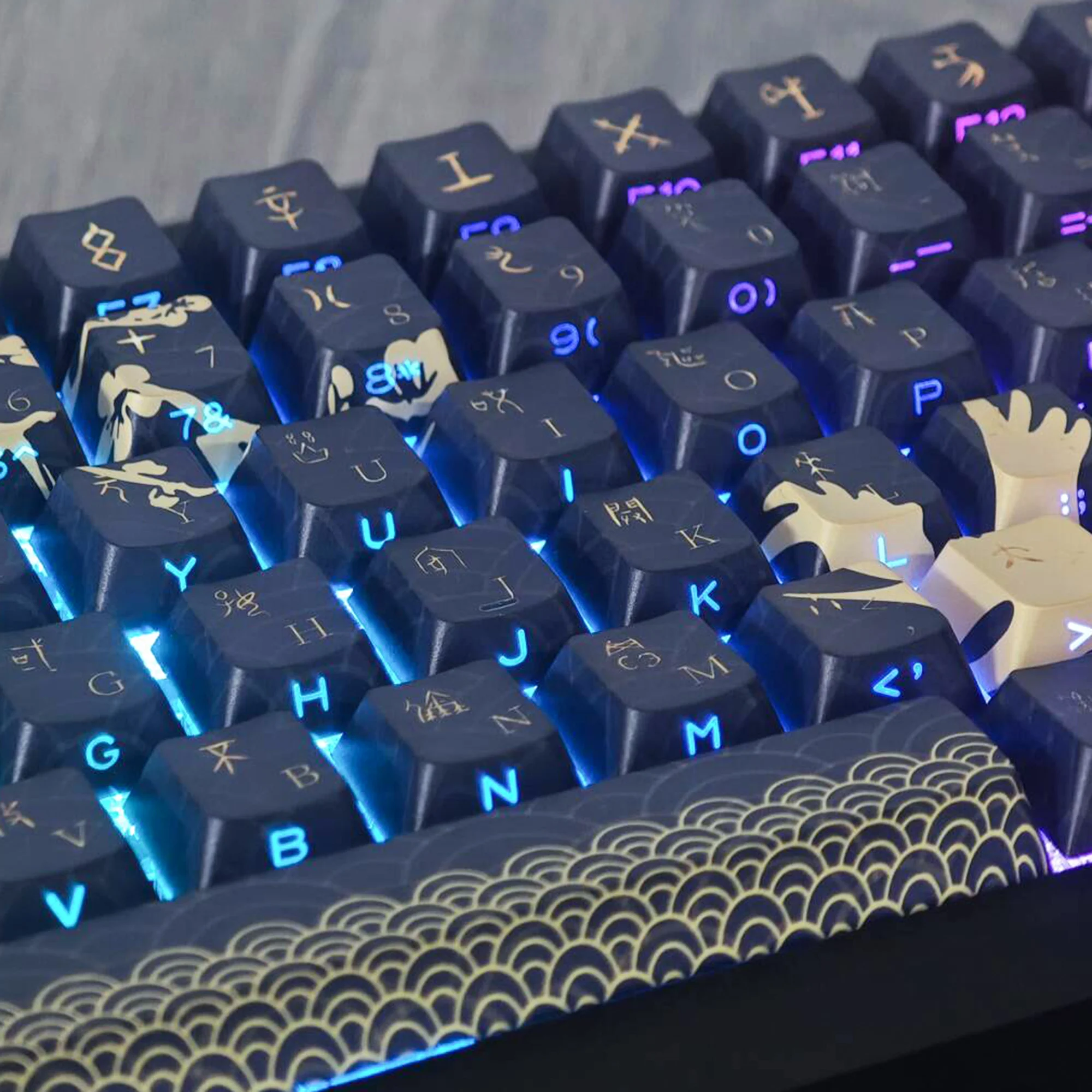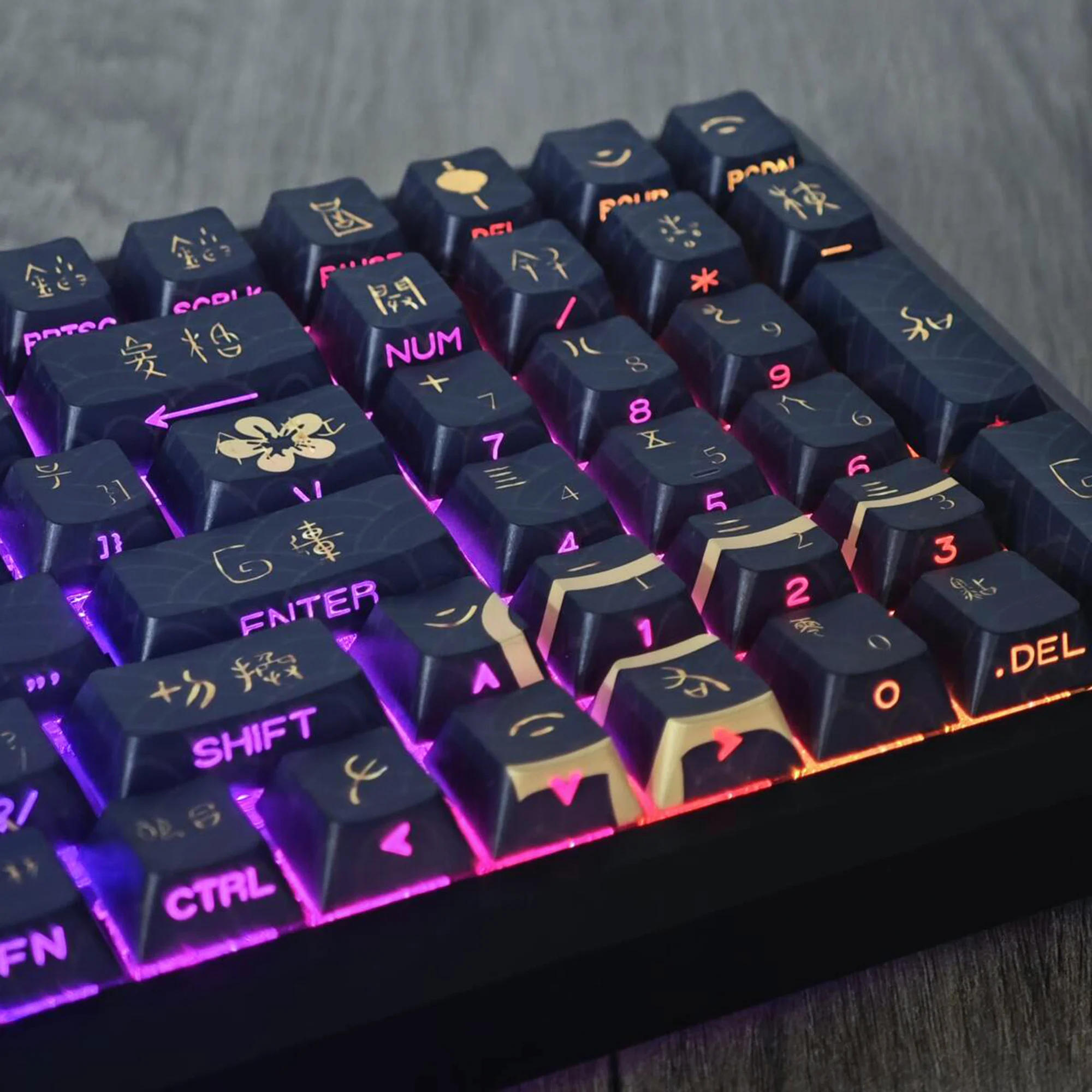 Transform your mechanical keyboard with this set of 120 high-quality PBT double-shot shine-through keycaps featuring a sleek navy or indigo background, intricate gold Asian-inspired artwork, traditional motifs, and bright neon pink and purple labels. The translucent design with side-lit shine-through enhances the elegant glow and highlights the detailed symbols, creating a vibrant, artistic aesthetic. With a cherry profile of approximately 1.5-1.7mm thickness, these keycaps are compatible with most ANSI MX mechanical and optical keyboards, from 61 to 108 keys, with a 6.25u spacebar. Elevate your keyboard’s style while enjoying durable, premium craftsmanship designed to fit your personalized setup perfectly.