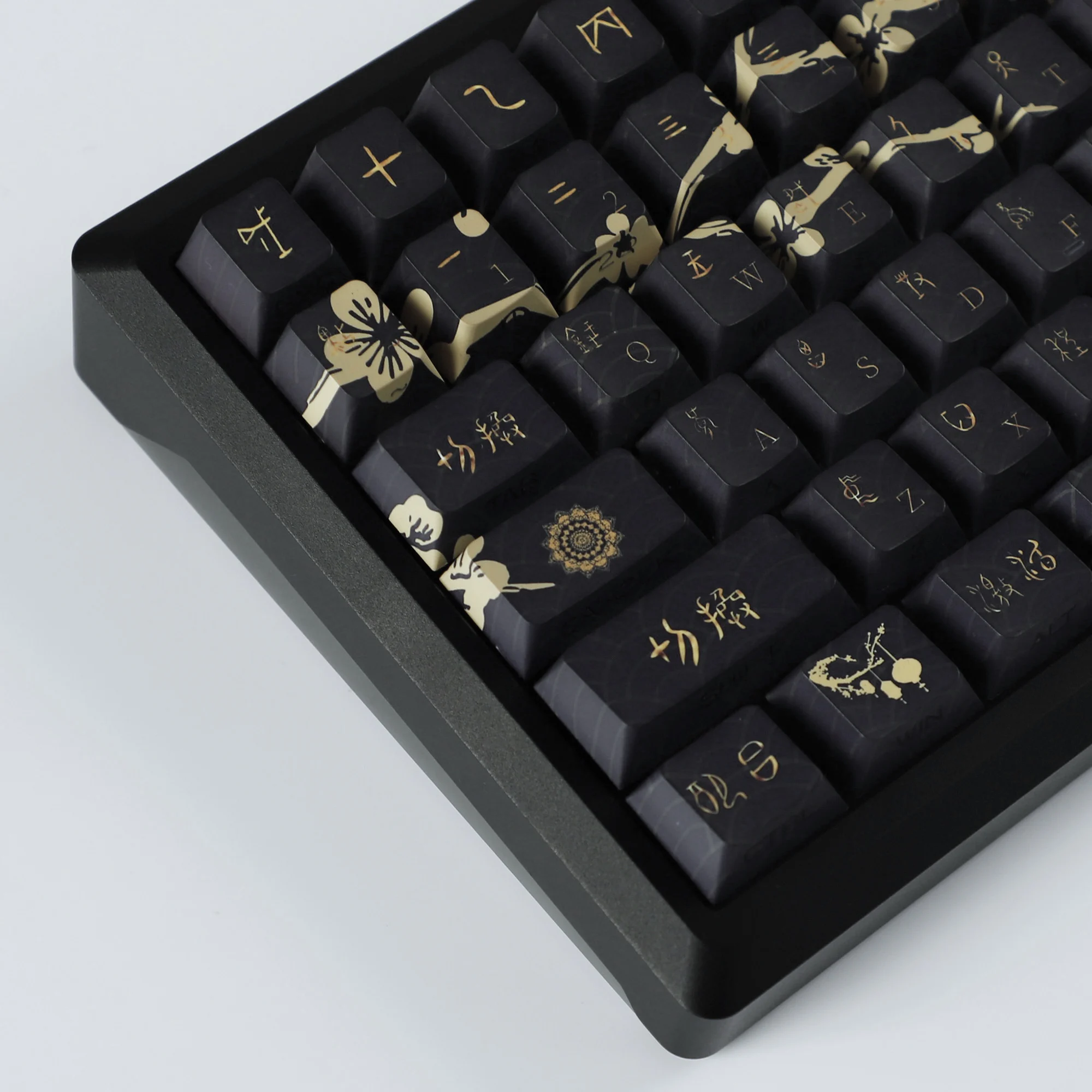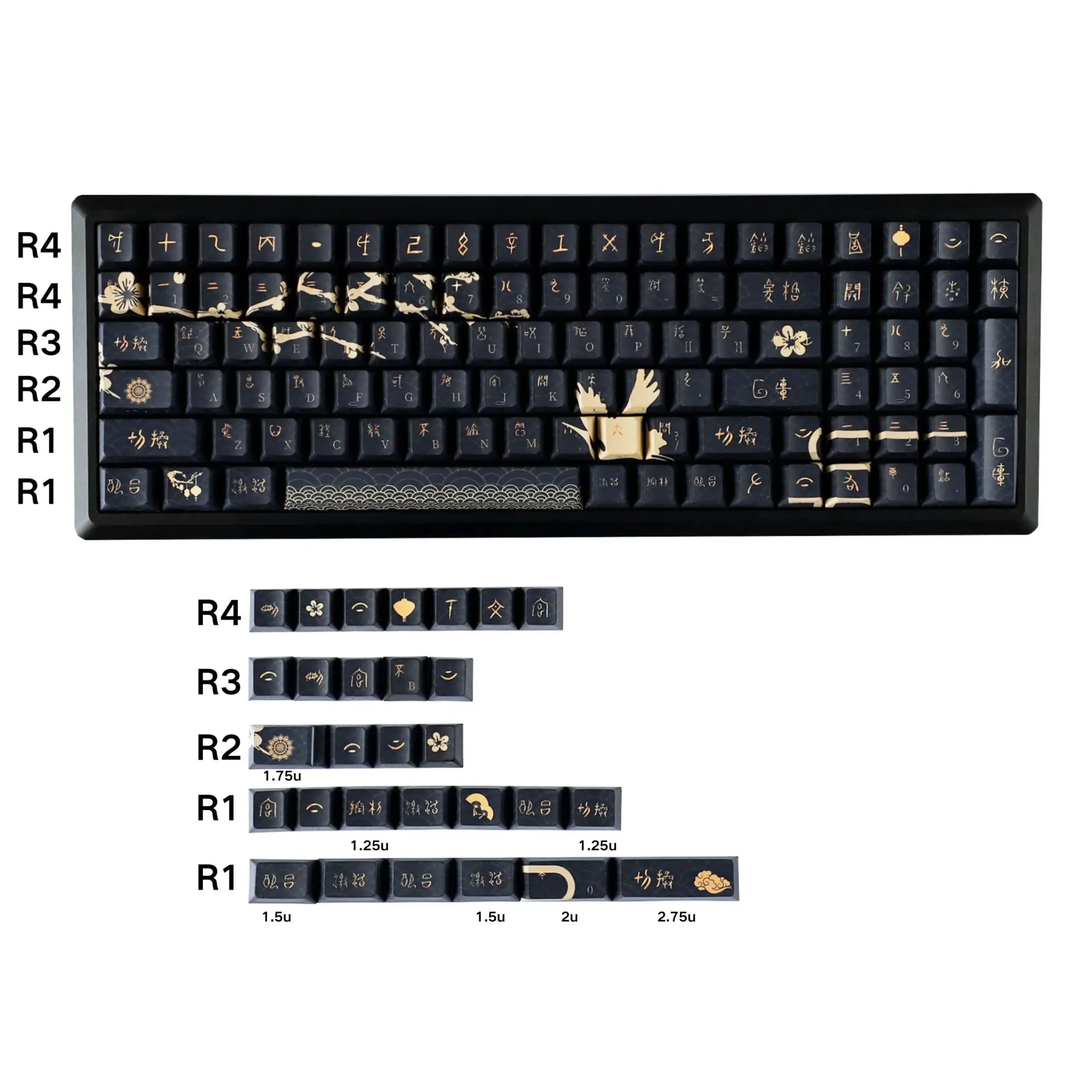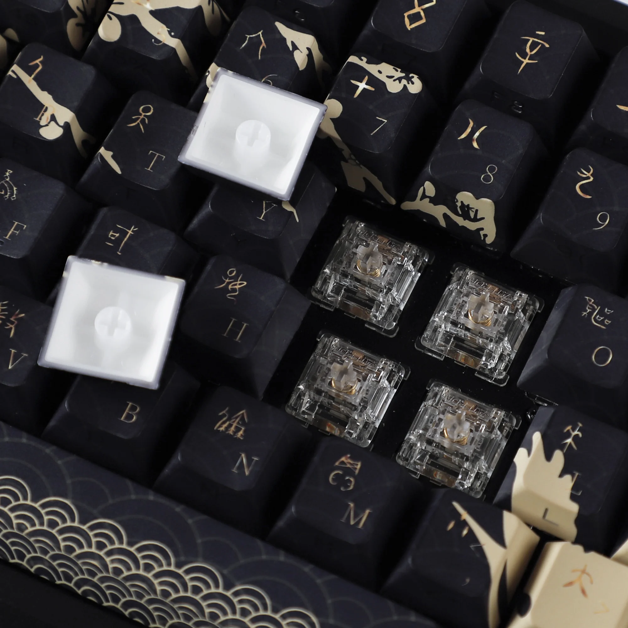 Transform your mechanical keyboard with this set of 120 high-quality PBT double-shot shine-through keycaps featuring a sleek navy or indigo background, intricate gold Asian-inspired artwork, traditional motifs, and bright neon pink and purple labels. The translucent design with side-lit shine-through enhances the elegant glow and highlights the detailed symbols, creating a vibrant, artistic aesthetic. With a cherry profile of approximately 1.5-1.7mm thickness, these keycaps are compatible with most ANSI MX mechanical and optical keyboards, from 61 to 108 keys, with a 6.25u spacebar. Elevate your keyboard’s style while enjoying durable, premium craftsmanship designed to fit your personalized setup perfectly.
