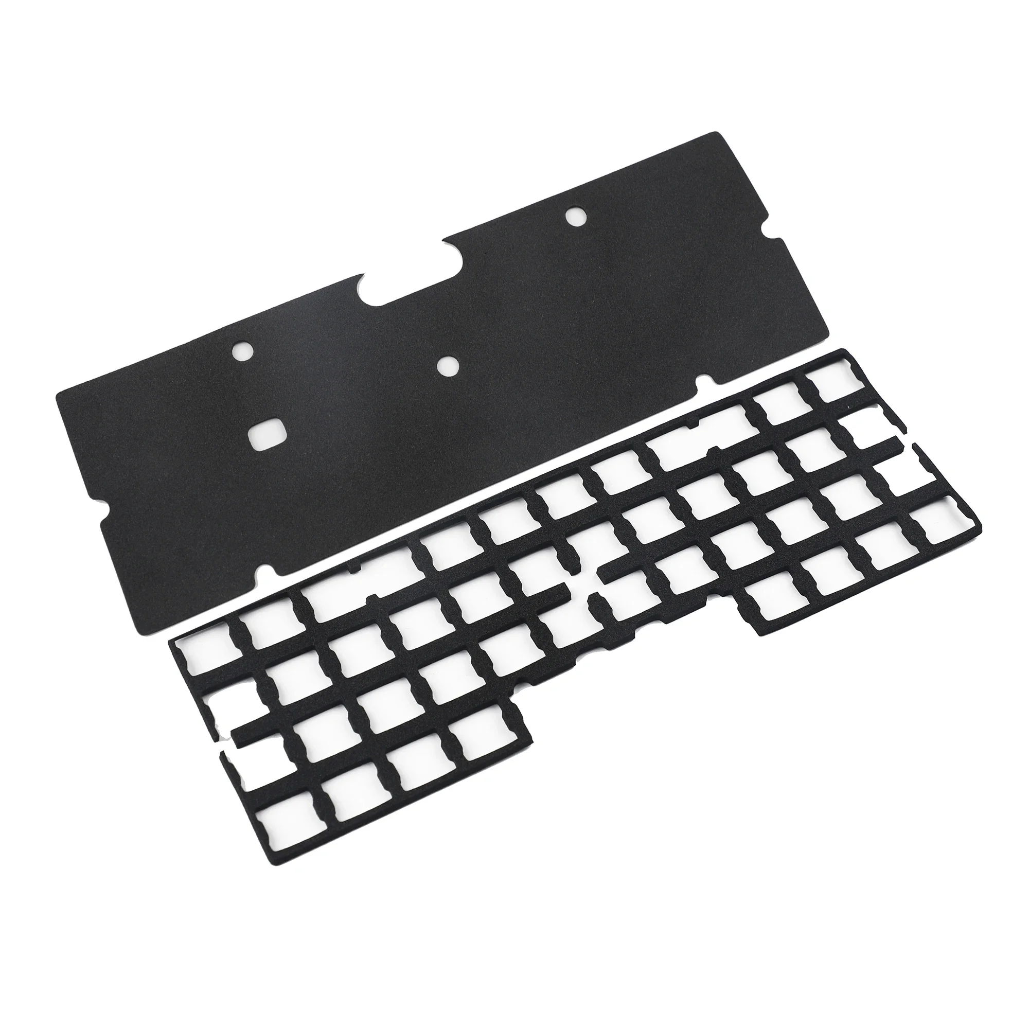 Experience improved sound quality and vibration dampening with this specifically designed foam kit compatible with the YMDK Air40 RGB hot-swap keyboard. Crafted from high-quality materials, the kit includes a top foam layer of approximately 3.5mm thickness and a 2mm thick bottom foam. The top foam features a smooth, matte black surface with precisely cut circular and rectangular openings, providing effective sound absorption while maintaining a sleek, technical look. The bottom foam’s grid-like pattern offers subtle geometric aesthetics while absorbing vibrations. Easily installed, these components transform your keyboard’s feel and acoustics, allowing for a more satisfying typing experience. Whether you want to upgrade or customize, this kit is a perfect addition to elevate your keyboard setup.