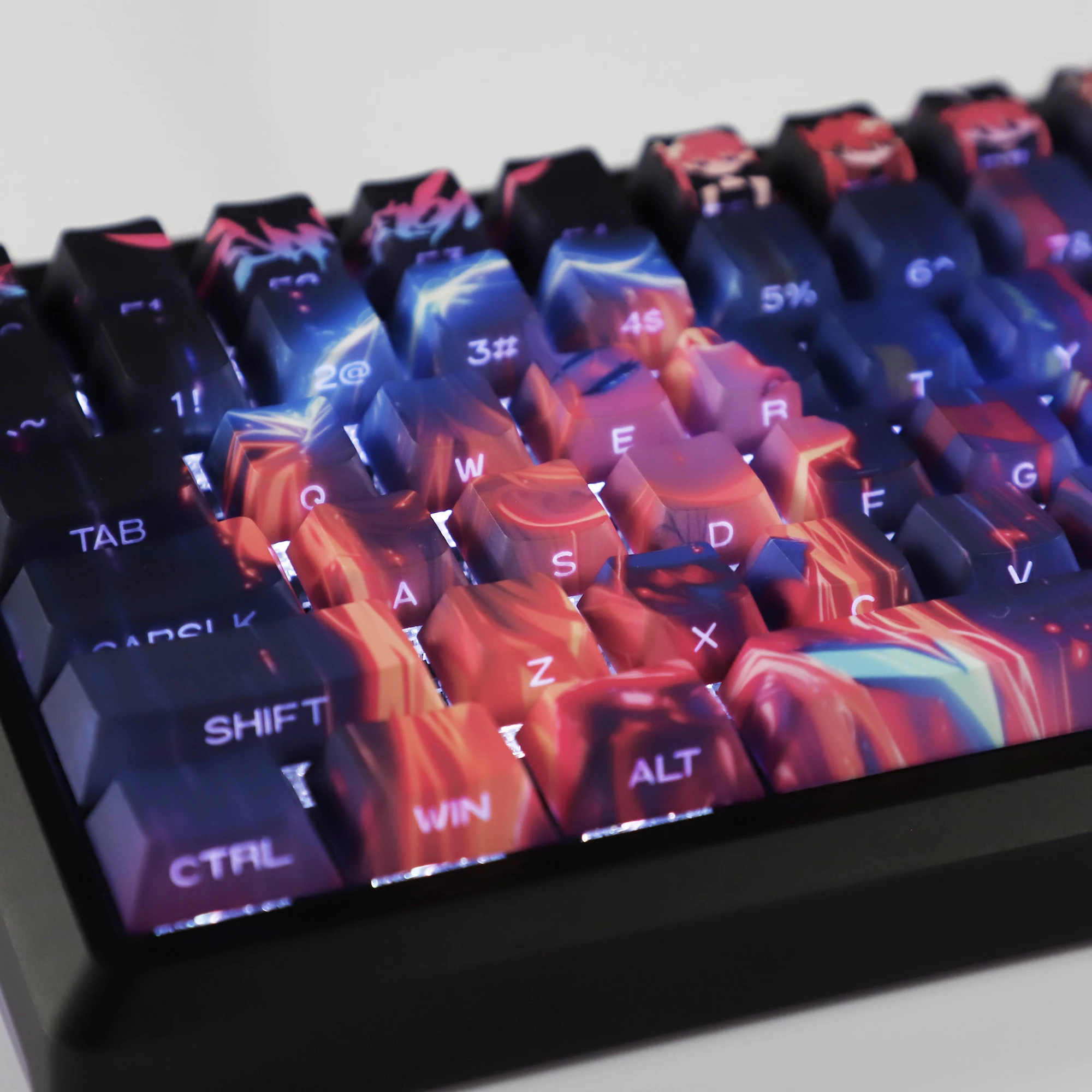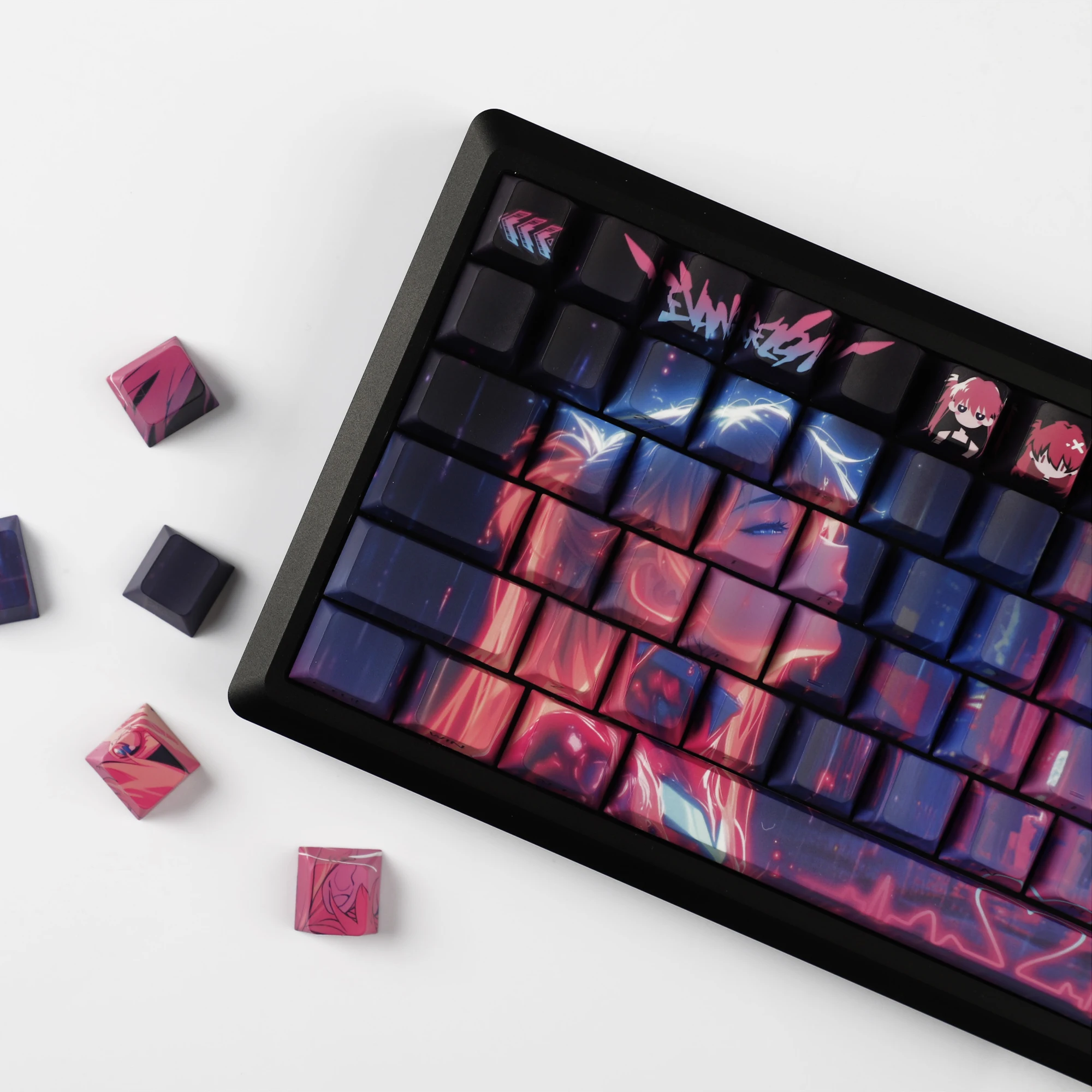 Enhance your mechanical keyboard with this set of 131 double-shot PBT keycaps featuring vibrant, fade-proof dye sublimation legends and a comfortable Cherry profile. Approximately 1.5-1.6mm thick, these keycaps deliver a textured feel and are compatible with most MX mechanical keyboards in layouts from 60% to 100%, including sizes 61, 64, 68, 84, 87, 96, 98, 104, and 108 keys, with a 6.25u (about 4.61″) spacebar. Designed for south-facing LED backlit keyboards, they offer striking, colorful aesthetics inspired by anime and gaming culture, perfect for creating a bold and energetic setup.
