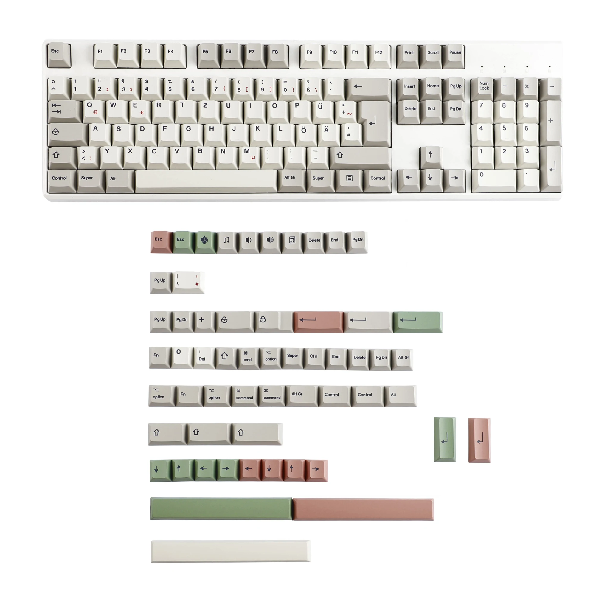 Transform your mechanical keyboard into a minimalist masterpiece with this beautifully crafted YMDK keycap set. The keycaps feature a sleek white frame combined with elegant shades of beige and cream, creating a neutral, sophisticated aesthetic perfect for any workspace or gaming setup. The textured matte finish not only enhances the visual appeal but also provides a comfortable, tactile feel with durable 1.5-1.6mm thick PBT material. The legends are dye sublimation printed, ensuring they will never fade over time, maintaining clarity and style for years. Customizable with vibrant loose keycaps in green, pink, or white, this set is designed for versatility and personal expression while offering excellent compatibility with a wide range of MX mechanical keyboards and layouts. Elevate your typing experience with this elegant, thoughtful keycap set.