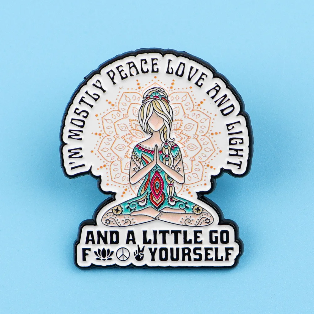 Experience the perfect blend of style and spirituality with this enchanting set of two double-sided brooches. Each brooch features a captivating seated meditative figure adorned with vibrant colors in shades of teal and pastel. Encircled by intricate mandala motifs, the design is both soothing and striking, complemented by the impactful texts that bring attitude and humor. Made from durable alloy, these versatile accessories are suitable for both males and females and can enhance jackets, hats, backpacks, or DIY clothing projects. With a trendy fusion of retro, punk, and hip-hop aesthetics, these brooches will elevate your fashion statement while reminding you to embrace peace and positivity.