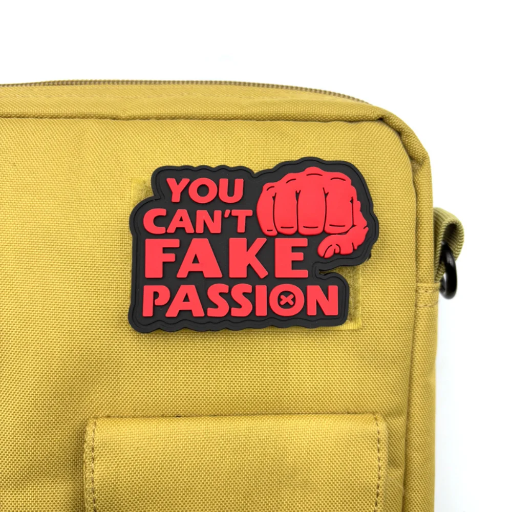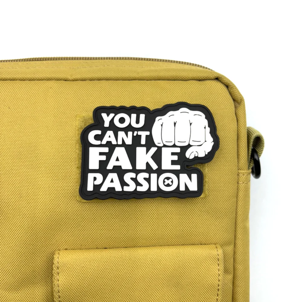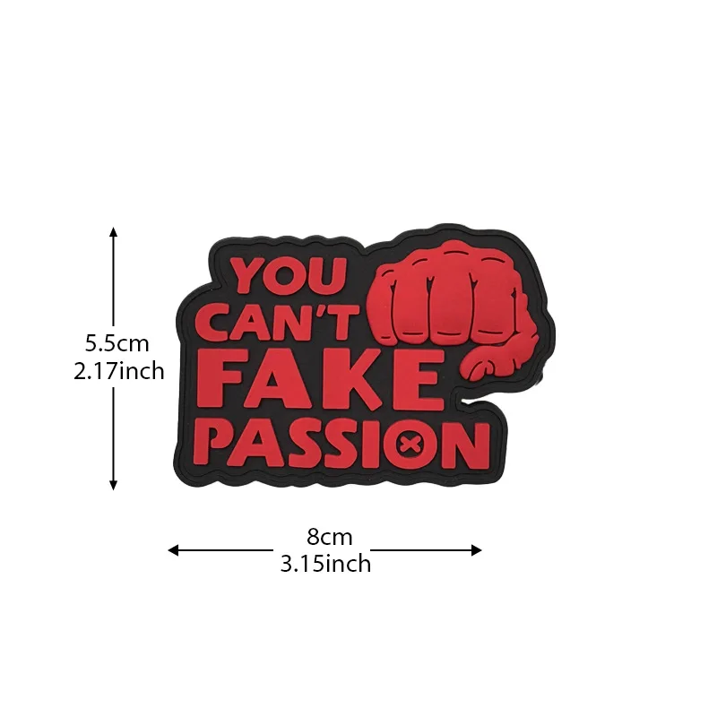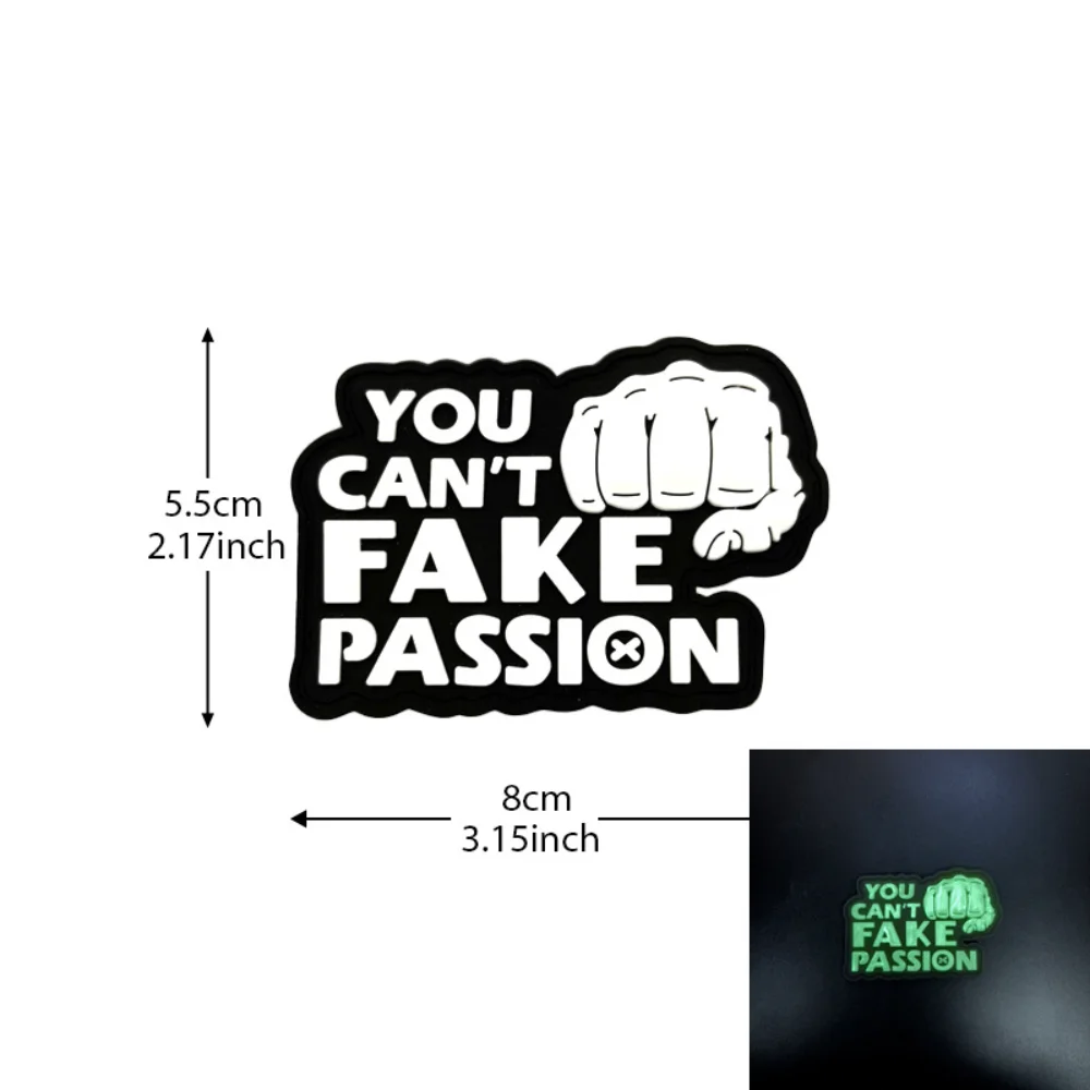 Experience the bold expression of passion with this PVC soft rubber glow-in-the-dark patch. Measuring approximately 2.17″ by 3.15″, each patch is expertly designed for versatility, making it perfect for your jackets, backpacks, hats, or even military vests. With its eco-friendly materials and hook and loop backing, you can easily attach it anywhere you want to showcase your enthusiasm. The collection features four distinct designs, each with a powerful fist graphic, highlighting the message “YOU CAN'T FAKE PASSION.” Get ready to elevate your style and inspire authenticity with these vibrant patches that appear uniquely stunning in the dark.