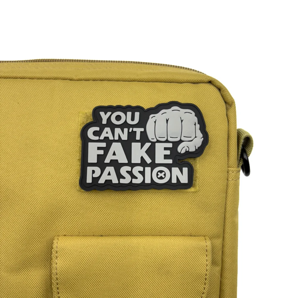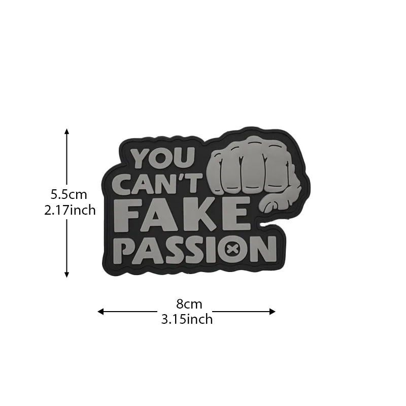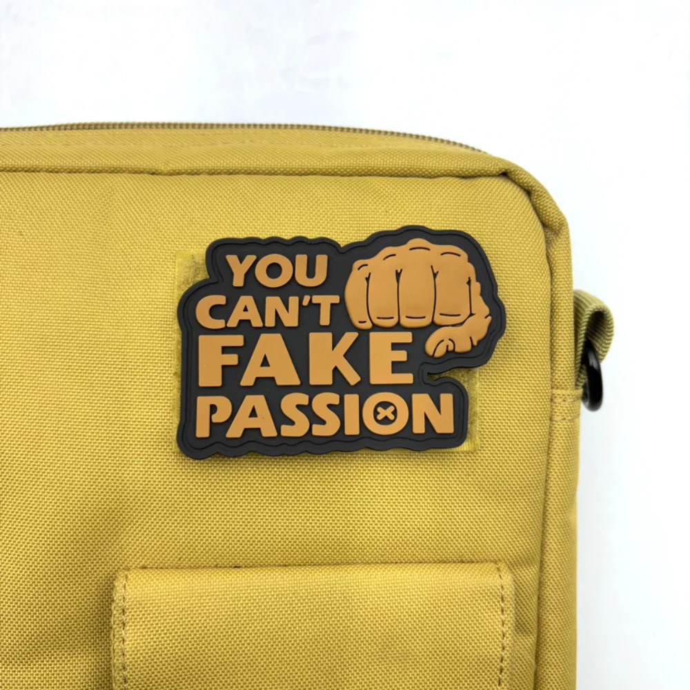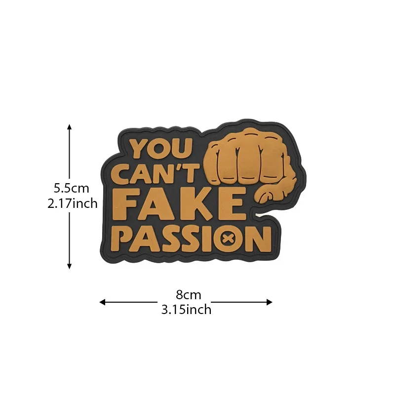 Experience the bold expression of passion with this PVC soft rubber glow-in-the-dark patch. Measuring approximately 2.17″ by 3.15″, each patch is expertly designed for versatility, making it perfect for your jackets, backpacks, hats, or even military vests. With its eco-friendly materials and hook and loop backing, you can easily attach it anywhere you want to showcase your enthusiasm. The collection features four distinct designs, each with a powerful fist graphic, highlighting the message “YOU CAN'T FAKE PASSION.” Get ready to elevate your style and inspire authenticity with these vibrant patches that appear uniquely stunning in the dark.
